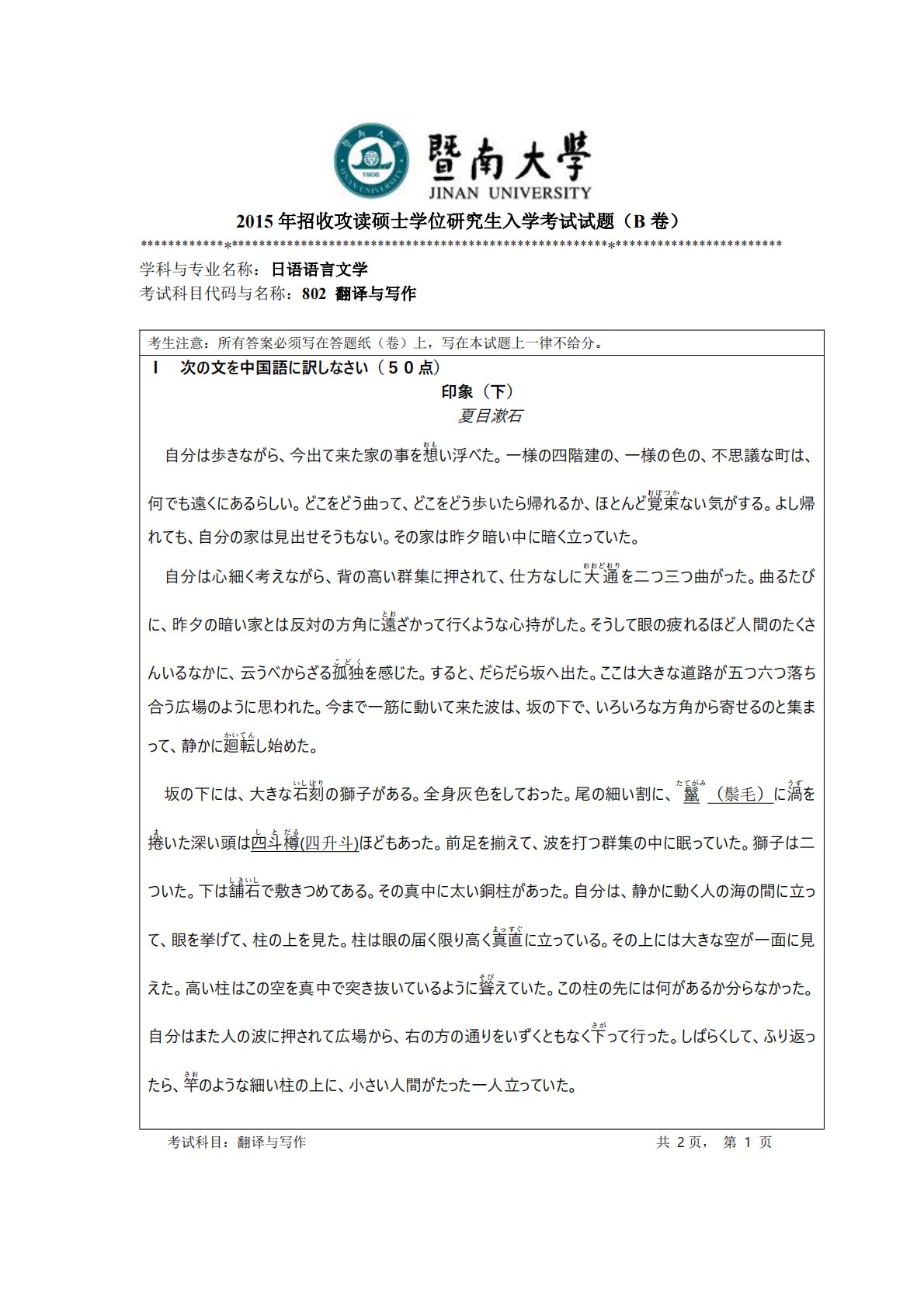 2015年招收攻读硕士学位研究生入学考试试题(B卷)********************************************************************************************学科与专业名称:日语语言文学考试科目代码与名称:802翻译与写作考生注意:所有答案必须写在答题纸(卷)上,写在本试题上一律不给分。Ⅰ次の文を中国語に訳しなさい(50点)印象(下)夏目漱石自分は歩きなら、今出て来た家の事をおも想い浮べた。一様の四階建の、一様の色の、不思議な町は、何でも遠くに\るらしい。どこをどう曲って、どこをどう歩いたら帰れるか、ほとんどおぼつ...