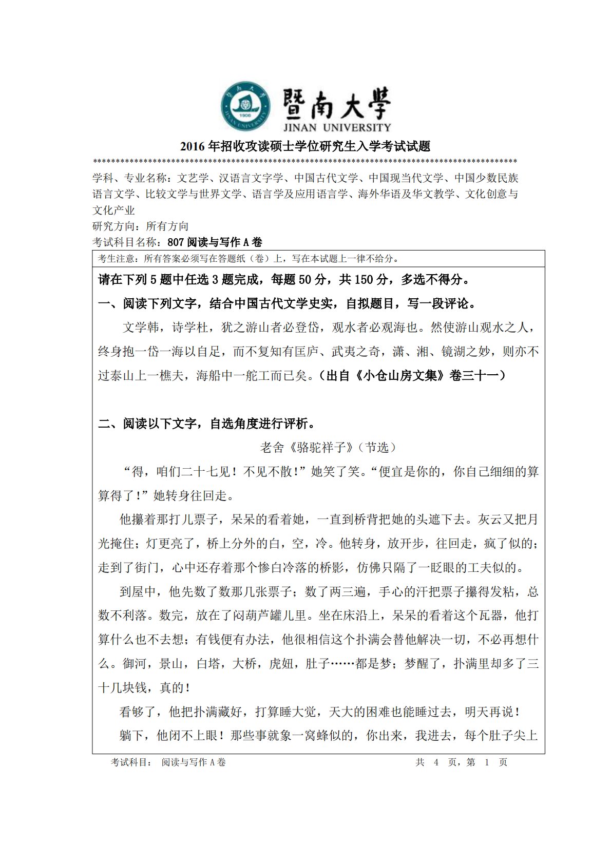 暨南大学807阅读与写作2016年真题