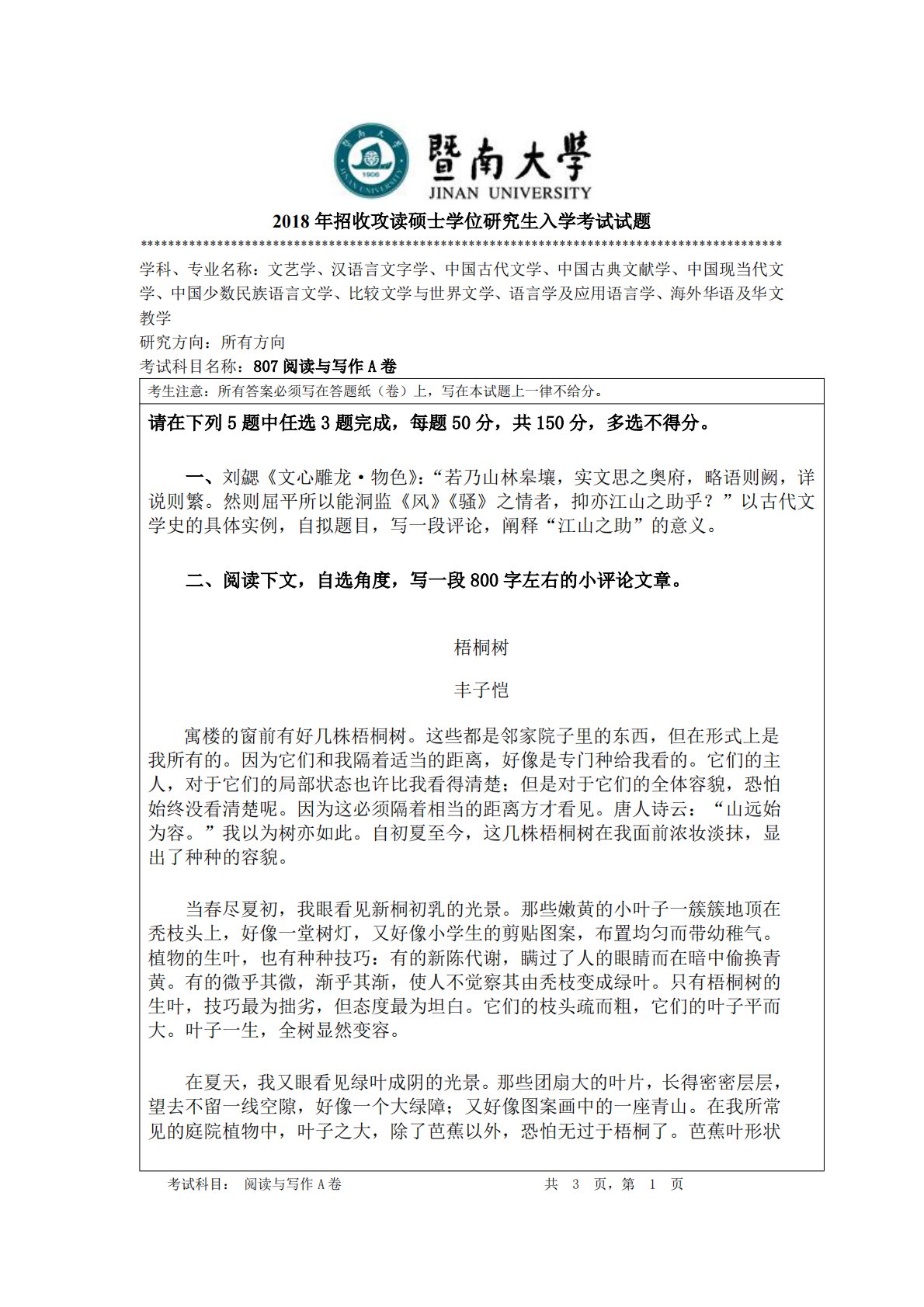 2018年招收攻读硕士学位研究生入学考试试题********************************************************************************************学科、专业名称:文艺学、汉语言文字学、中国古代文学、中国古典文献学、中国现当代文学、中国少数民族语言文学、比较文学与世界文学、语言学及应用语言学、海外华语及华文教学研究方向:所有方向考试科目名称:807阅读与写作A卷考生注意:所有答案必须写在答题纸(卷)上,写在本试题上一律不给分。请在下列5题中任选3题完成,每题50分,共150分,多选不得分。一、刘勰《文心雕龙·物色》...