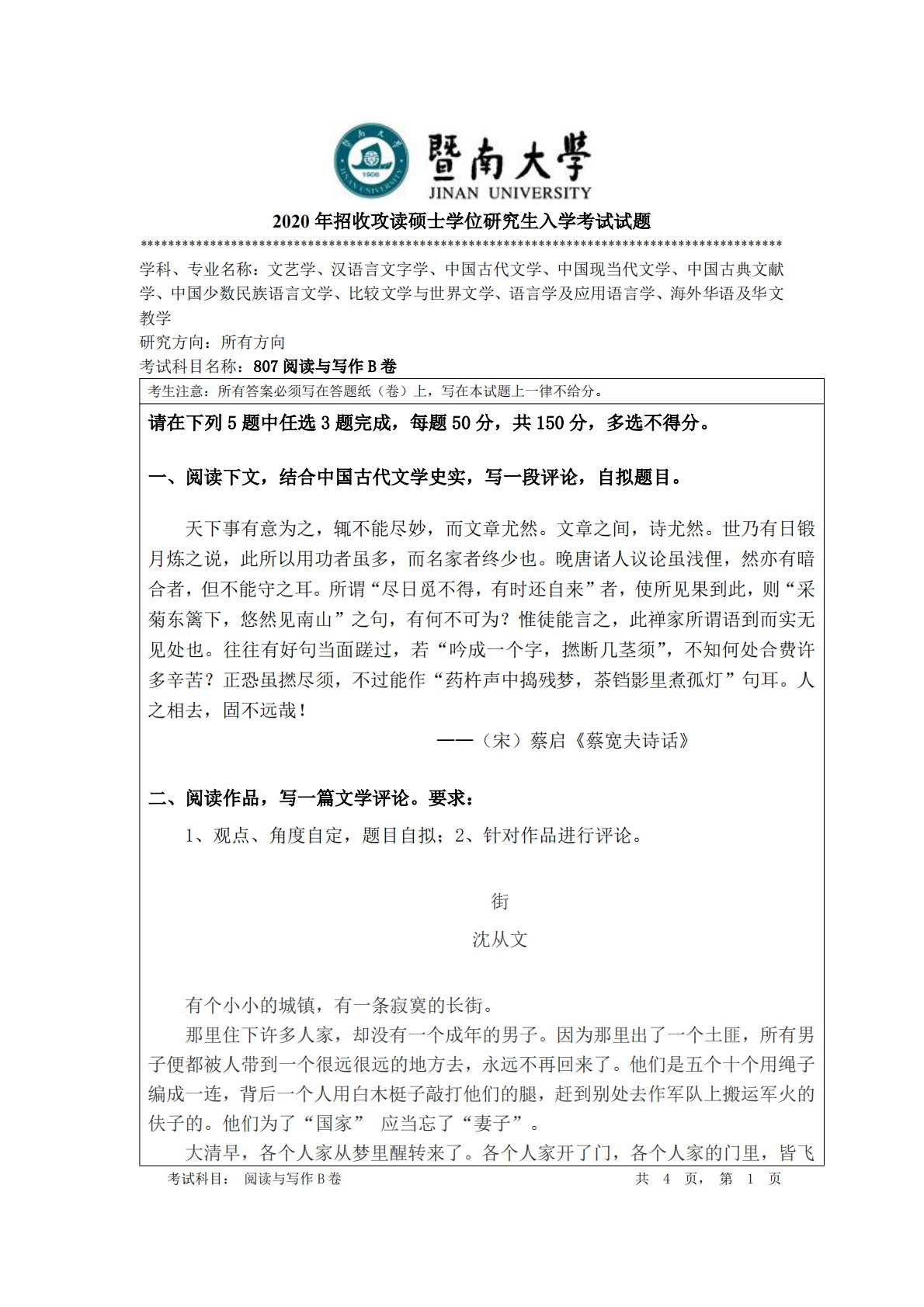 暨南大学807阅读与写作2020年真题