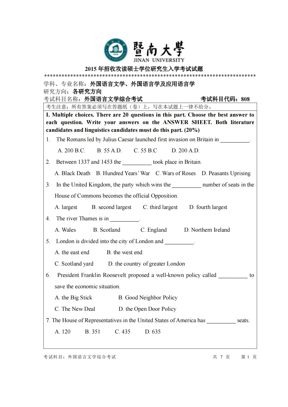 考试科目:外国语言文学综合考试共7页第1页2015年招收攻读硕士学位研究生入学考试试题*************************************************************************学科、专业名称:外国语言文学、外国语言学及应用语言学研究方向:各研究方向考试科目名称:外国语言文学综合考试考试科目代码:808考生注意:所有答案必须写在答题纸(卷)上,写在本试题上一律不给分。I.Multiplechoices.Thereare20questionsinthispart.Choosethebestanswertoeachquestion.Writey...