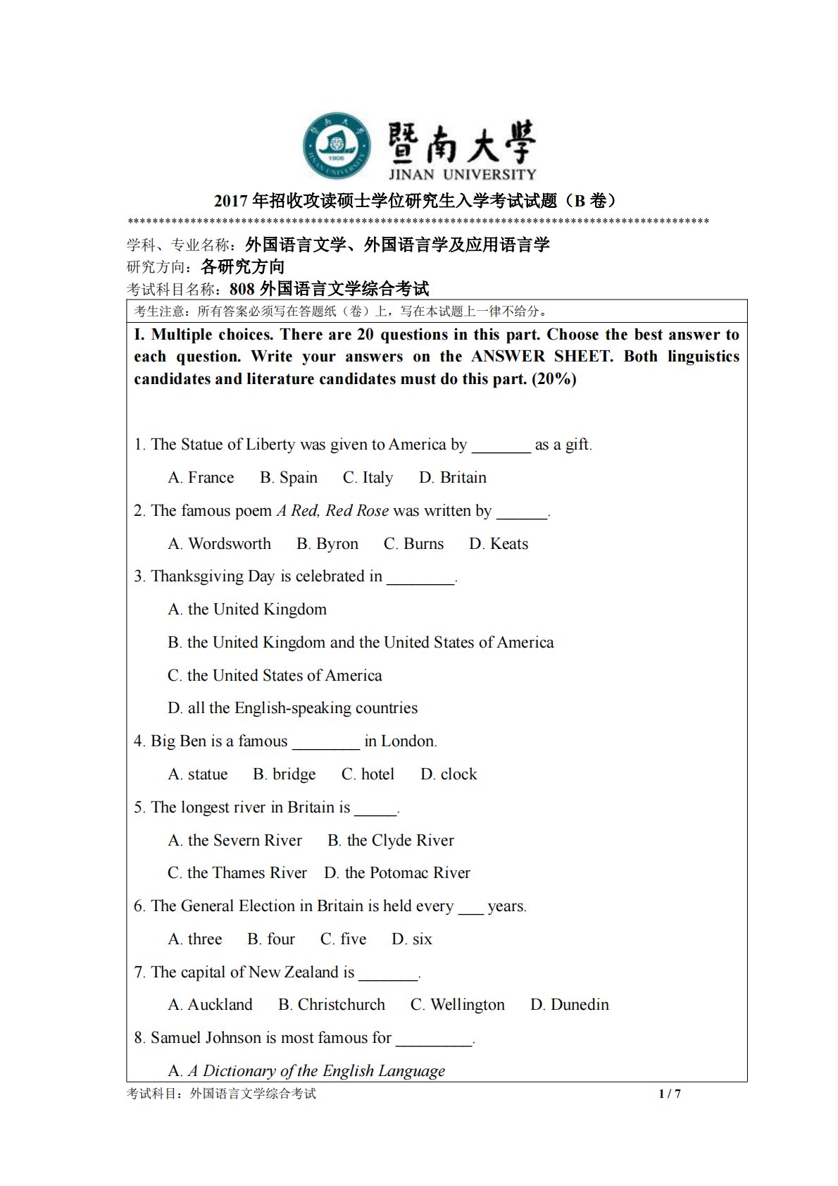 考试科目:外国语言文学综合考试1/72017年招收攻读硕士学位研究生入学考试试题(B卷)********************************************************************************************学科、专业名称:外国语言文学、外国语言学及应用语言学研究方向:各研究方向考试科目名称:808外国语言文学综合考试考生注意:所有答案必须写在答题纸(卷)上,写在本试题上一律不给分。I.Multiplechoices.Thereare20questionsinthispart.Choosethebestanswertoeachqu...