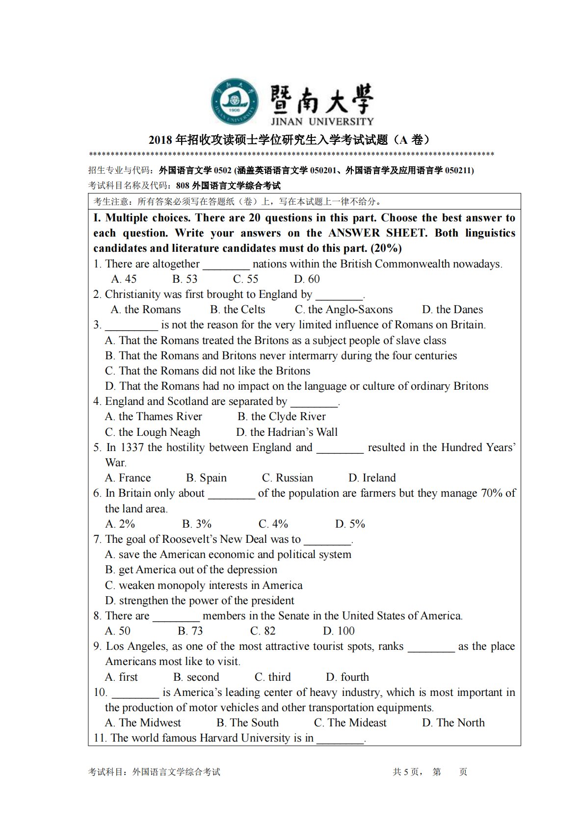 考试科目:外国语言文学综合考试共5页,第页2018年招收攻读硕士学位研究生入学考试试题(A卷)********************************************************************************************招生专业与代码:外国语言文学0502(涵盖英语语言文学050201、外国语言学及应用语言学050211)考试科目名称及代码:808外国语言文学综合考试考生注意:所有答案必须写在答题纸(卷)上,写在本试题上一律不给分。I.Multiplechoices.Thereare20questionsinthispart.Choos...