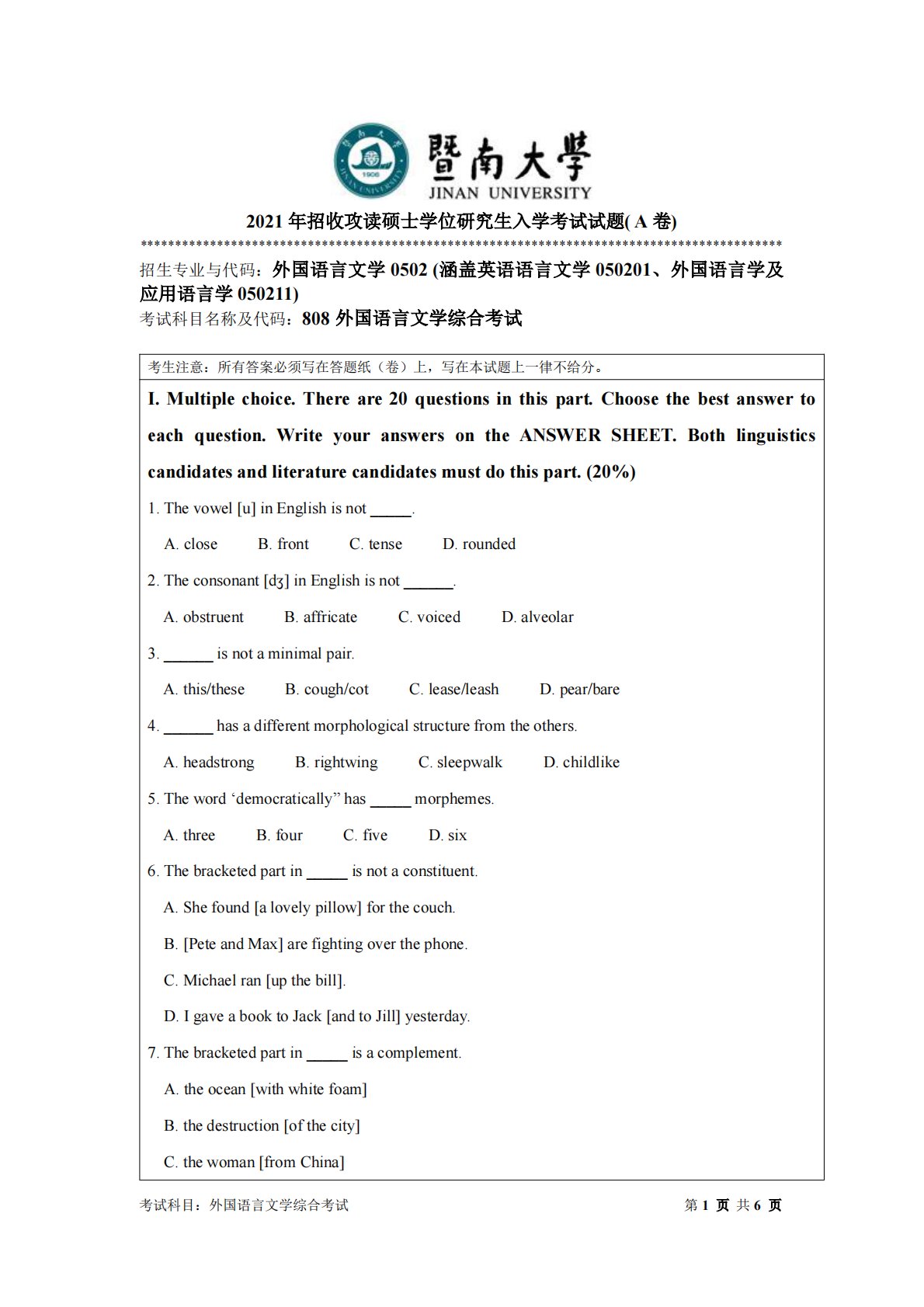考试科目:外国语言文学综合考试第1页共6页2021年招收攻读硕士学位研究生入学考试试题(A卷)********************************************************************************************招生专业与代码:外国语言文学0502(涵盖英语语言文学050201、外国语言学及应用语言学050211)考试科目名称及代码:808外国语言文学综合考试考生注意:所有答案必须写在答题纸(卷)上,写在本试题上一律不给分。I.Multiplechoice.Thereare20questionsinthispart.Choose...