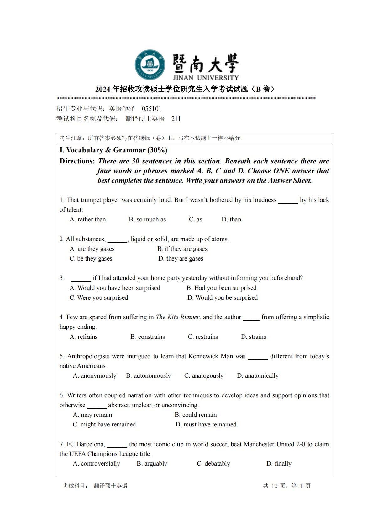 考试科目:翻译硕士英语共12页,第1页2024年招收攻读硕士学位研究生入学考试试题(B卷)********************************************************************************************招生专业与代码:英语笔译055101考试科目名称及代码:翻译硕士英语211考生注意:所有答案必须写在答题纸(卷)上,写在本试题上一律不给分。I.Vocabulary&Grammar(30%)Directions:Thereare30sentencesinthissection.Beneatheachsentencethere...
