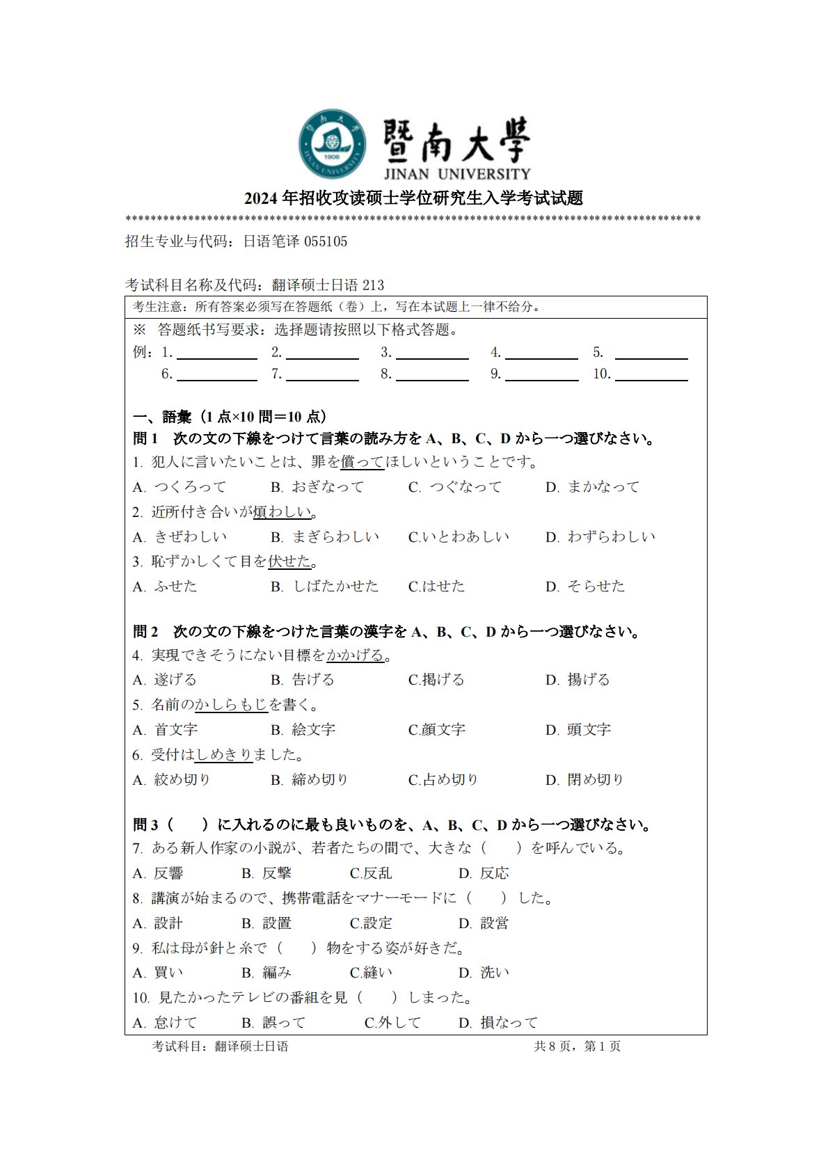 2024年招收攻读硕士学位研究生入学考试试题********************************************************************************************招生专业与代码:日语笔译055105考试科目名称及代码:翻译硕士日语213考生注意:所有答案必须写在答题纸(卷)上,写在本试题上一律不给分。※答题纸书写要求:选择题请按照以下格式答题。例:1.2.3.4.5.6.7.8.9.10.一、語彙(1点×10問=10点)問1次の文の下線をつけて言葉の読み方をA、B、C、Dから一つ選びなさい。1.犯人に言いたいことは、罪を償ってほ...