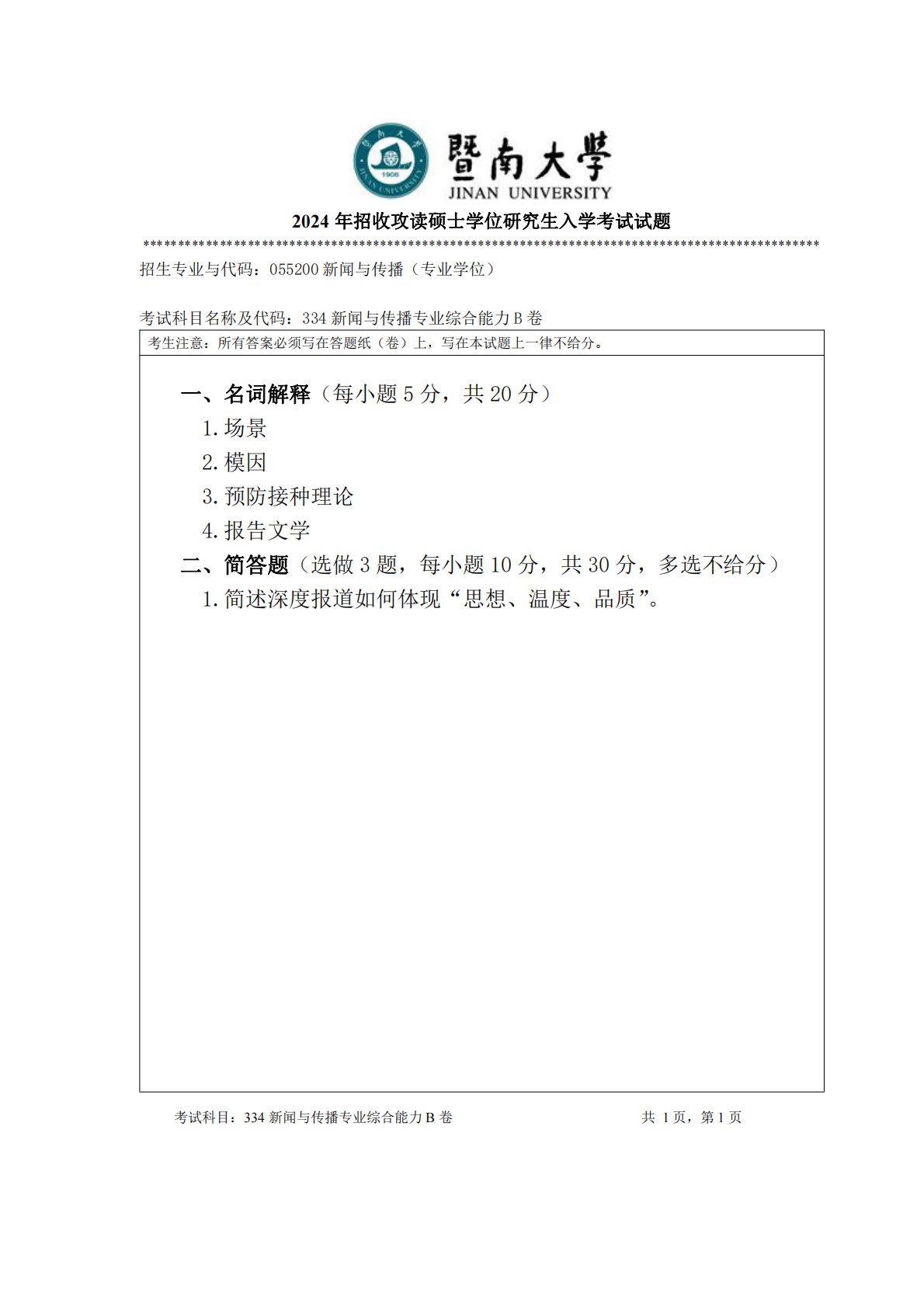 2024年招收攻读硕士学位研究生入学考试试题*************************************************************************************************招生专业与代码:055200新闻与传播(专业学位)考试科目名称及代码:334新闻与传播专业综合能力B卷考生注意:所有答案必须写在答题纸(卷)上,写在本试题上一律不给分。一、名词解释(每小题5分,共20分)1.场景2.模因3.预防接种理论4.报告文学二、简答题(选做3题,每小题10分,共30分,多选不给分)1.简述深度报道如何体现“思想、温度、品质”。考试科目:...