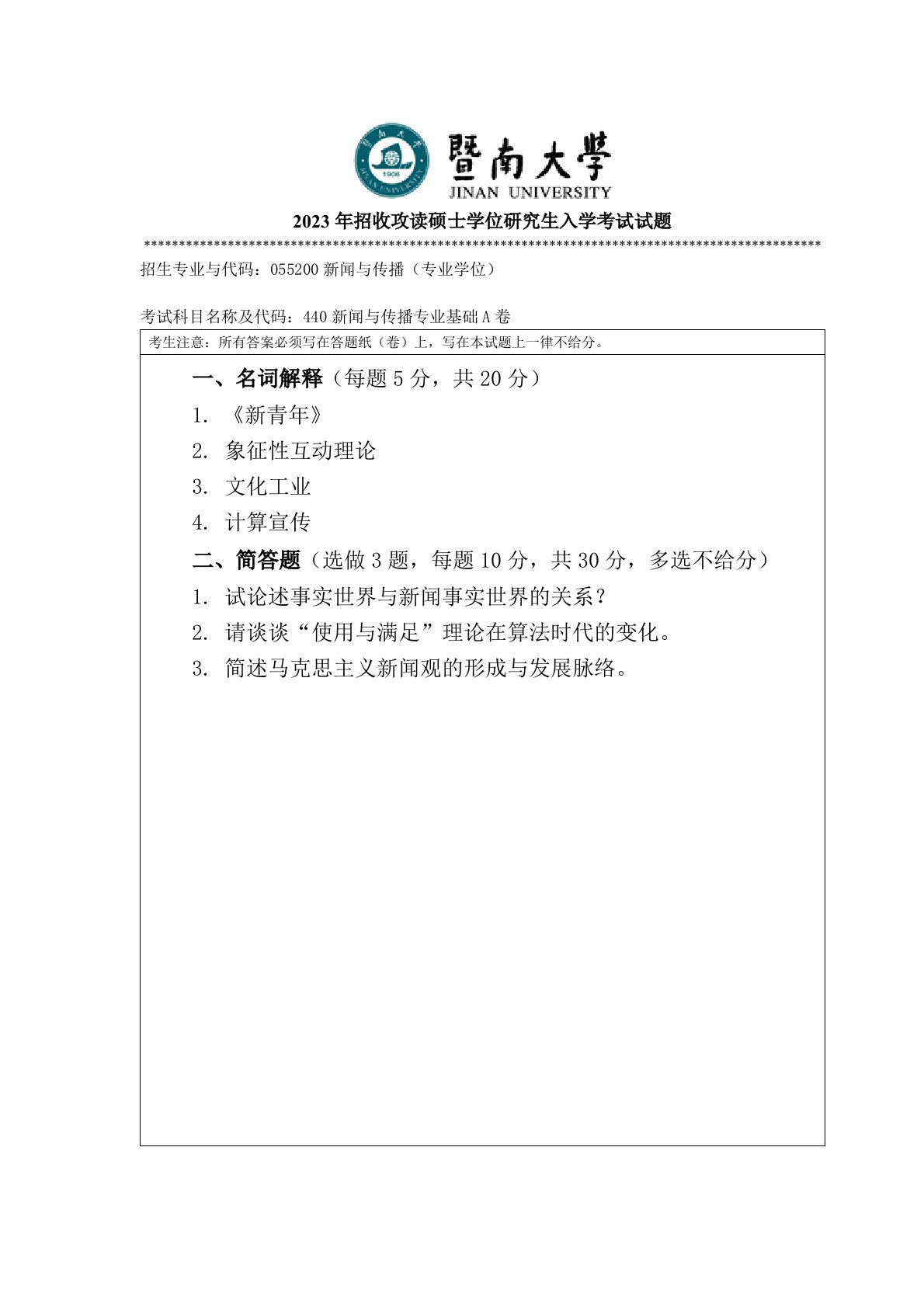 厦门大学440新闻与传播专业基础2023年真题