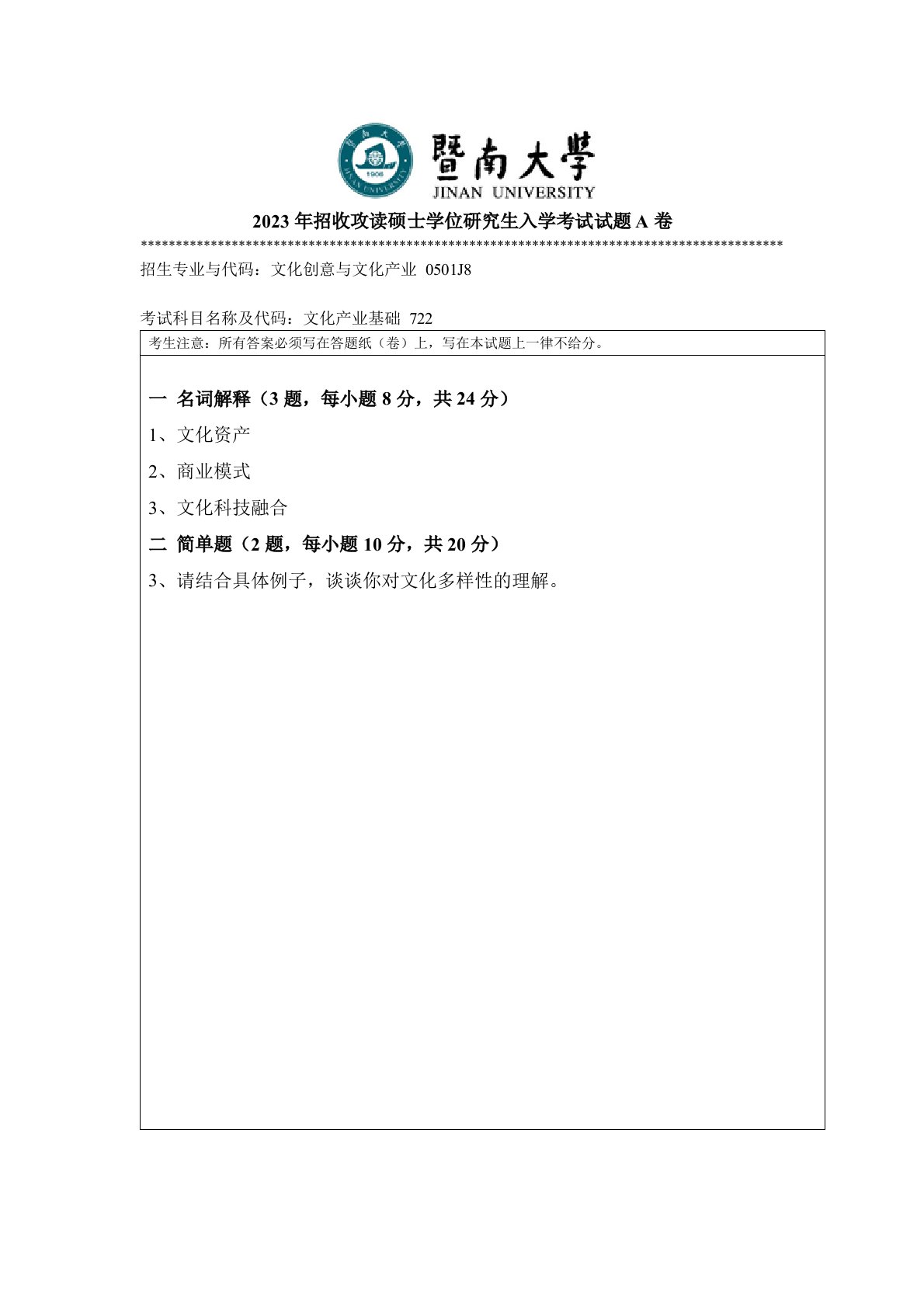 暨南大学722文化产业基础2023年真题.doc