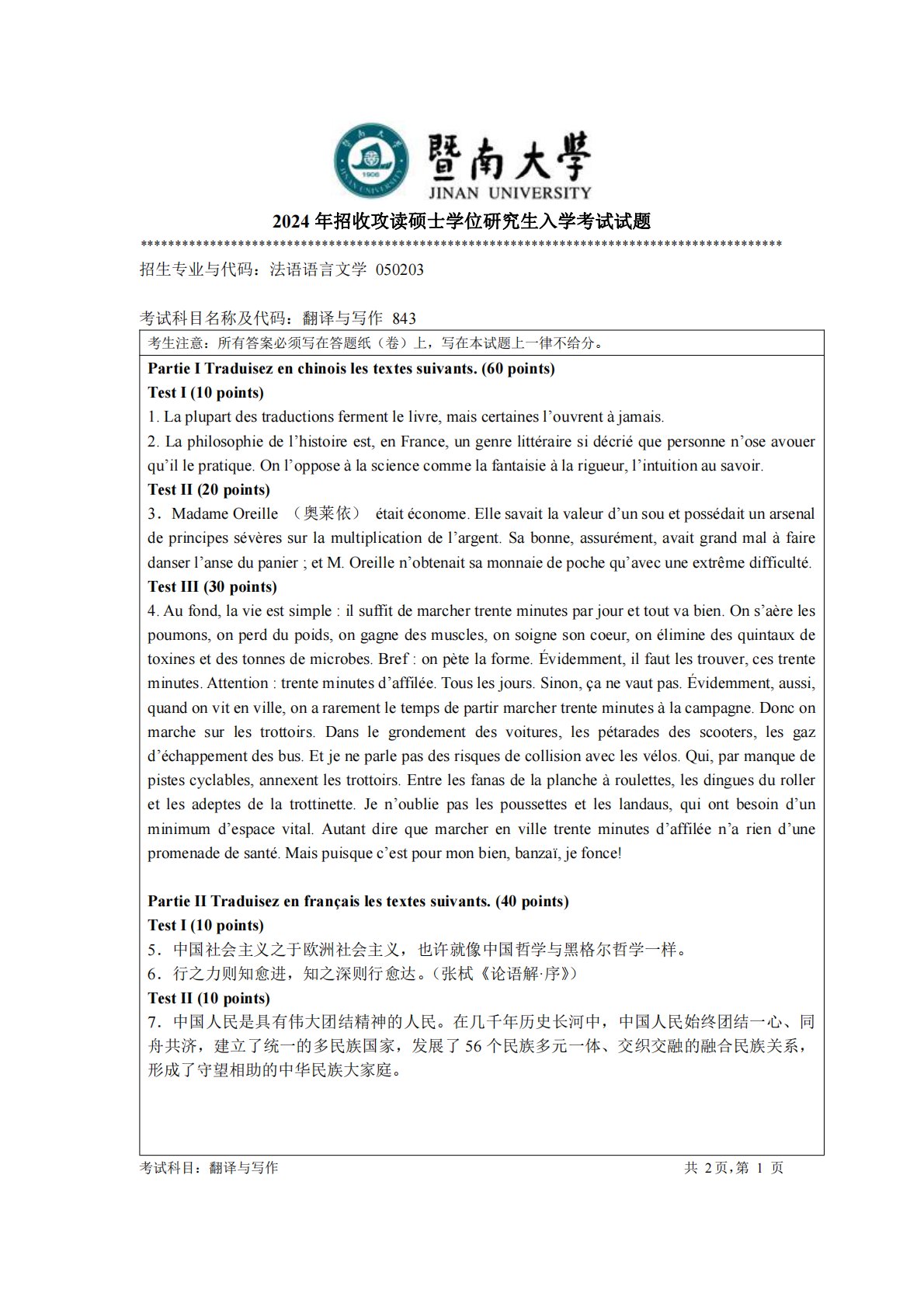 2024年招收攻读硕士学位研究生入学考试试题********************************************************************************************招生专业与代码:法语语言文学050203考试科目名称及代码:翻译与写作843考生注意:所有答案必须写在答题纸(卷)上,写在本试题上一律不给分。PartieITraduisezenchinoislestextessuivants.(60points)TestI(10points)1.Laplupartdestraductionsfermentlelivre,maiscer...