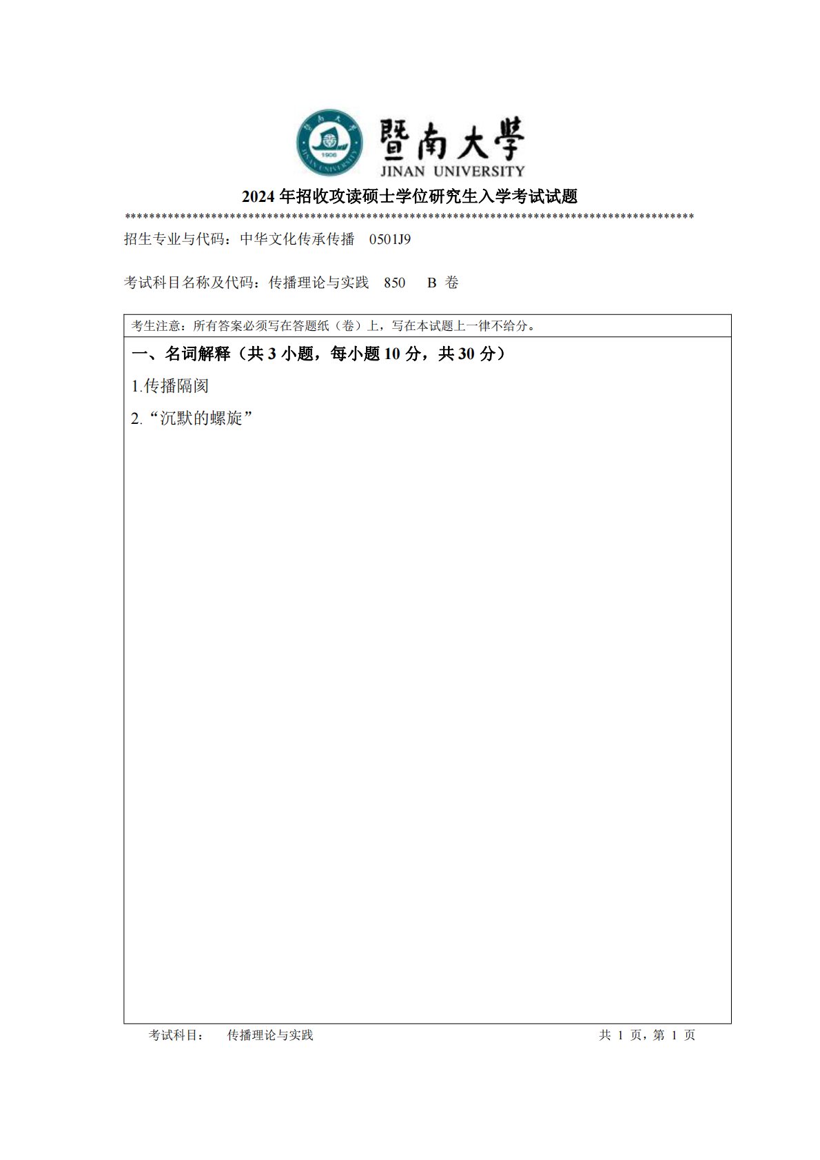 2024年招收攻读硕士学位研究生入学考试试题********************************************************************************************招生专业与代码:中华文化传承传播0501J9考试科目名称及代码:传播理论与实践850B卷考生注意:所有答案必须写在答题纸(卷)上,写在本试题上一律不给分。一、名词解释(共3小题,每小题10分,共30分)1.传播隔阂2.“沉默的螺旋”考试科目:传播理论与实践共1页,第1页2024年招收攻读硕士学位研究生入学考试试题*****************************...