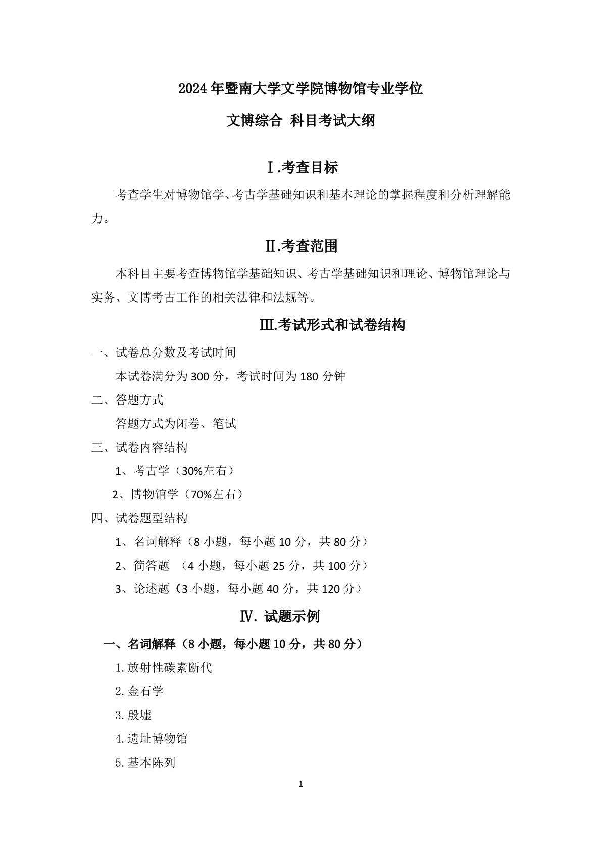 2024年暨南大学文学院博物馆专业学位文博综合科目考试大纲Ⅰ.考查目标考查学生对博物馆学、考古学基础知识和基本理论的掌握程度和分析理解能力。Ⅱ.考查范围本科目主要考查博物馆学基础知识、考古学基础知识和理论、博物馆理论与实务、文博考古工作的相关法律和法规等。Ⅲ.考试形式和试卷结构一、试卷总分数及考试时间本试卷满分为300分,考试时间为180分钟答题方式答题方式为闭卷、笔试试卷内容结构1、考古学(30%左右)2、博物馆学(70%左右)四、试卷题型结构1、名词解释(8小题,每小题10分,共80分)2、简答题(4小题,每小题25分,共100分)3、论述题(3小题,每小题40分,共120分)Ⅳ.试题示例...