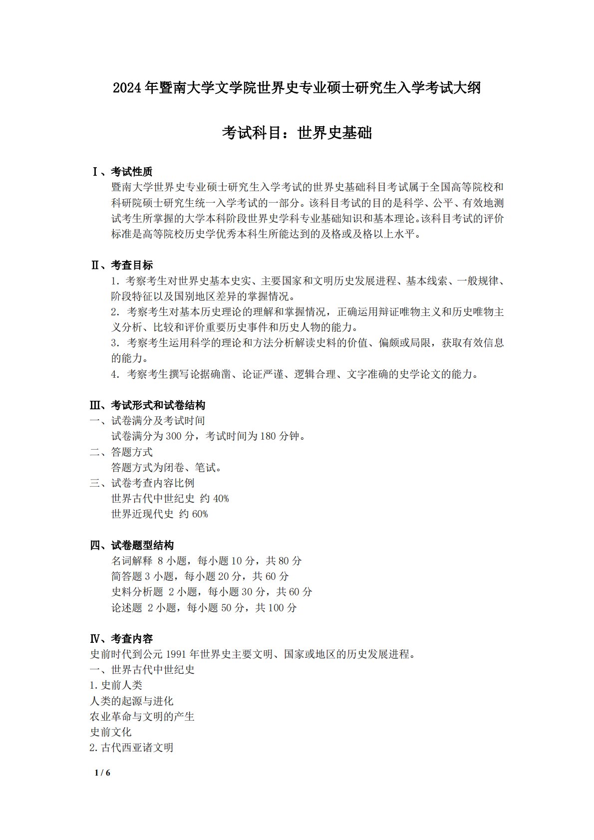 1/62024年暨南大学文学院世界史专业硕士研究生入学考试大纲考试科目:世界史基础Ⅰ、考试性质暨南大学世界史专业硕士研究生入学考试的世界史基础科目考试属于全国高等院校和科研院硕士研究生统一入学考试的一部分。该科目考试的目的是科学、公平、有效地测试考生所掌握的大学本科阶段世界史学科专业基础知识和基本理论。该科目考试的评价标准是高等院校历史学优秀本科生所能达到的及格或及格以上水平。Ⅱ、考查目标1.考察考生对世界史基本史实、主要国家和文明历史发展进程、基本线索、一般规律、阶段特征以及国别地区差异的掌握情况。2.考察考生对基本历史理论的理解和掌握情况,正确运用辩证唯物主义和历史唯物主义分析、比较和评价...