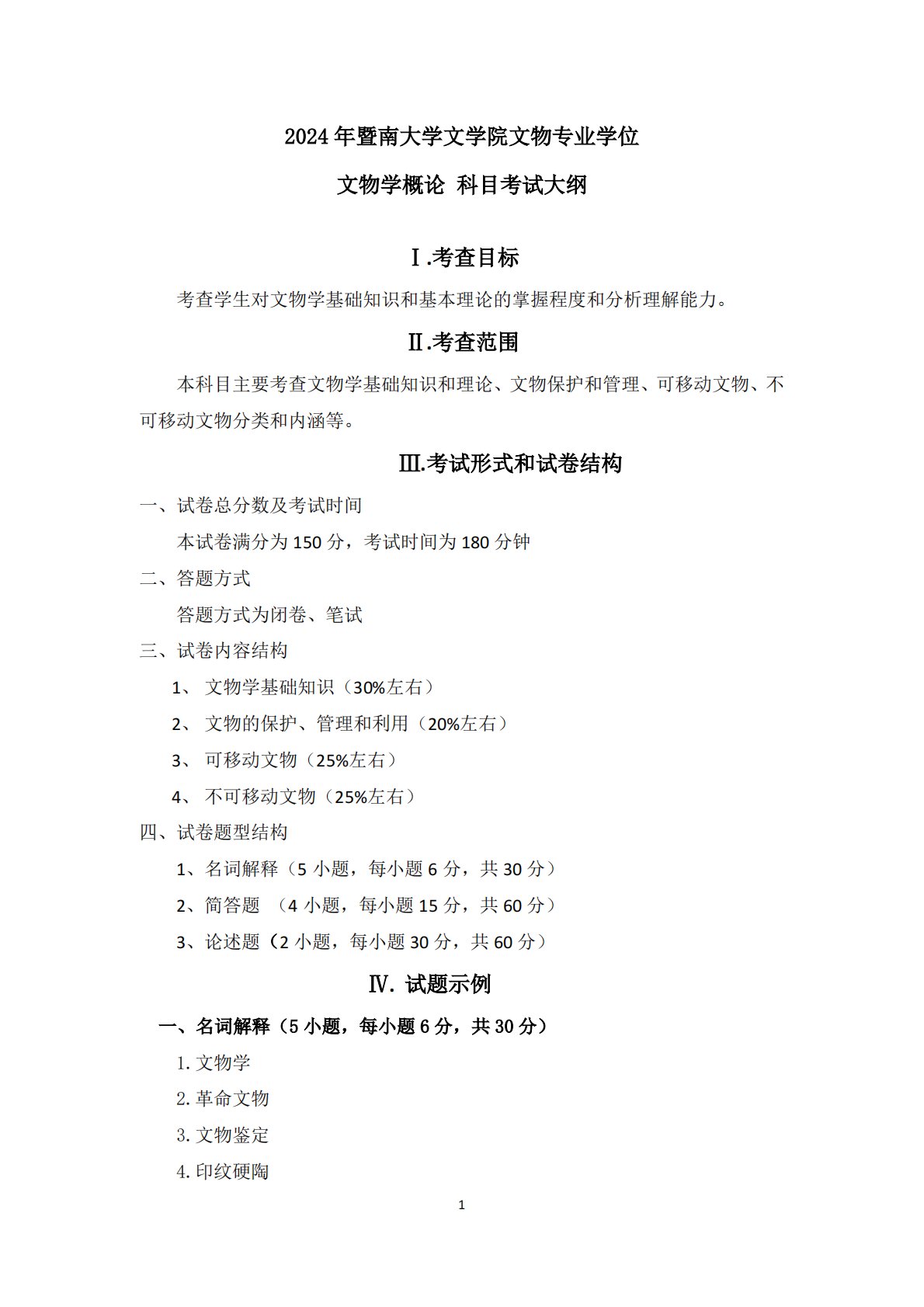 12024年暨南大学文学院文物专业学位文物学概论科目考试大纲Ⅰ.考查目标考查学生对文物学基础知识和基本理论的掌握程度和分析理解能力。Ⅱ.考查范围本科目主要考查文物学基础知识和理论、文物保护和管理、可移动文物、不可移动文物分类和内涵等。Ⅲ.考试形式和试卷结构一、试卷总分数及考试时间本试卷满分为150分,考试时间为180分钟二、答题方式答题方式为闭卷、笔试三、试卷内容结构1、文物学基础知识(30%左右)2、文物的保护、管理和利用(20%左右)3、可移动文物(25%左右)4、不可移动文物(25%左右)四、试卷题型结构1、名词解释(5小题,每小题6分,共30分)2、简答题(4小题,每小题15分,共60...
