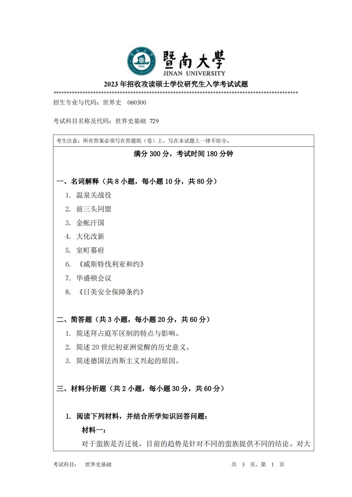 暨南大学729世界史基础2023年真题