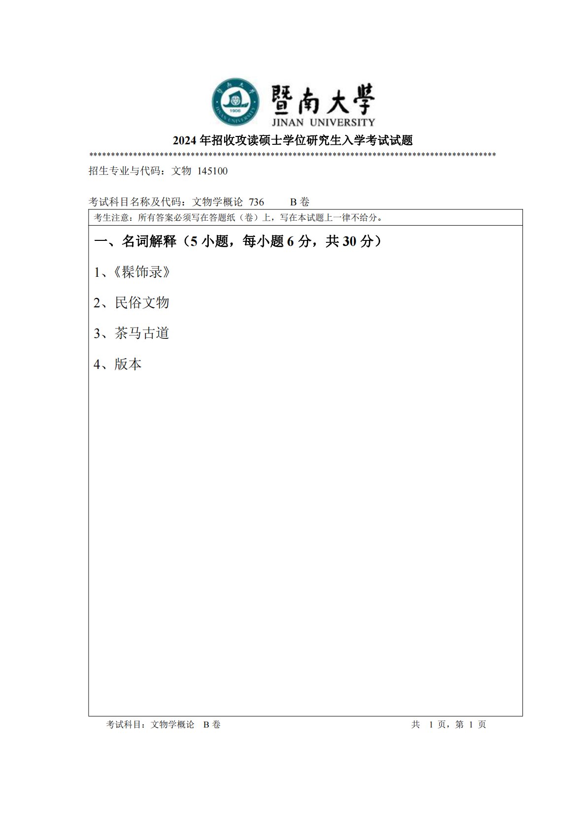 暨南大学736文物学概论2024年真题