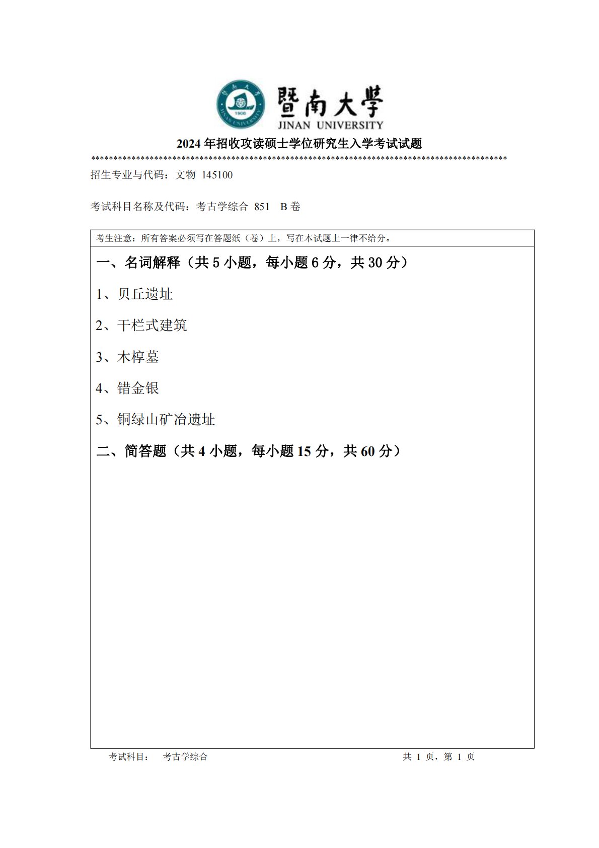 暨南大学851考古学综合2024年真题