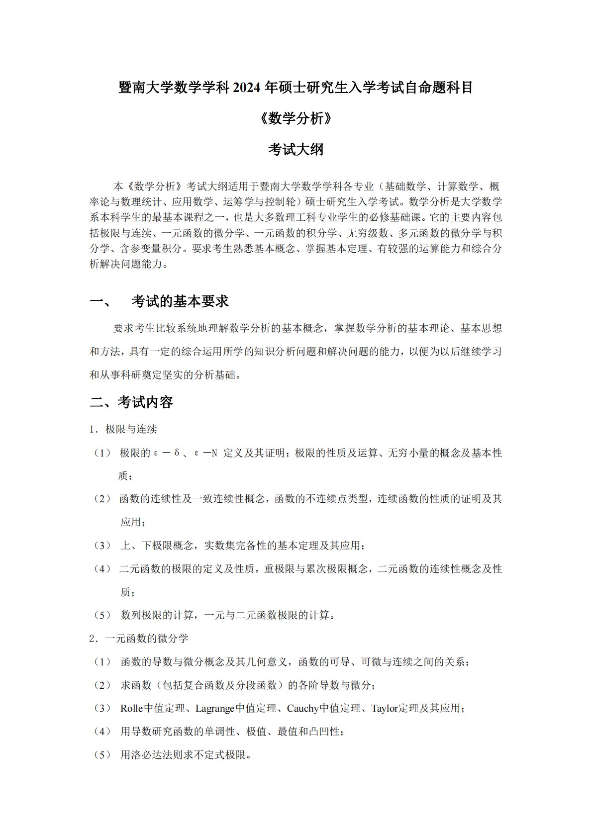 暨南大学数学学科2024年硕士研究生入学考试自命题科目《数学分析》考试大纲本《数学分析》考试大纲适用于暨南大学数学学科各专业(基础数学、计算数学、概率论与数理统计、应用数学、运筹学与控制轮)硕士研究生入学考试。数学分析是大学数学系本科学生的最基本课程之一,也是大多数理工科专业学生的必修基础课。它的主要内容包括极限与连续、一元函数的微分学、一元函数的积分学、无穷级数、多元函数的微分学与积分学、含参变量积分。要求考生熟悉基本概念、掌握基本定理、有较强的运算能力和综合分析解决问题能力。一、考试的基本要求要求考生比较系统地理解数学分析的基本概念,掌握数学分析的基本理论、基本思想和方法,具有一定的综合运...