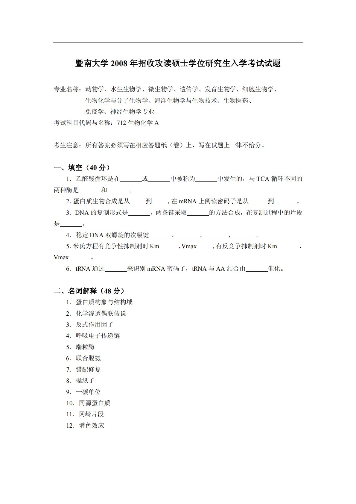 暨南大学2008年招收攻读硕士学位研究生入学考试试题专业名称:动物学、水生生物学、微生物学、遗传学、发育生物学、细胞生物学、生物化学与分子生物学、海洋生物学与生物技术、生物医药、免疫学、神经生物学专业考试科目代码与名称:712生物化学A考生注意:所有答案必须写在相应答题纸(卷)上,写在试题上一律不给分。一、填空(40分)1.乙醛酸循环是在或中被称为中发生的,与TCA循环不同的两种酶是和。2.蛋白质生物合成是从到,在mRNA上阅读密码子是从到。3.DNA的复制形式是,两条链采取的方法合成,在复制过程中的片段是。4.稳定DNA双螺旋的次级键、、、。5.米氏方程有竞争性抑制剂时Km、Vmax,有反竞...