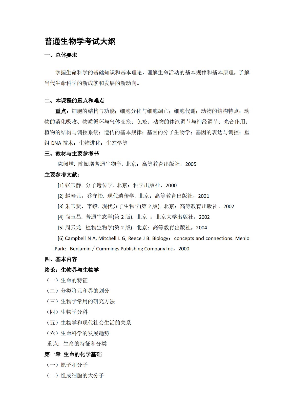 普通生物学考试大纲一、总体要求掌握生命科学的基础知识和基本理论,理解生命活动的基本规律和基本原理,了解当代生命科学的新成就和发展的新动向。二、本课程的重点和难点重点:细胞的结构与功能;细胞分化与细胞凋亡;细胞代谢;动物的结构特点;动物的消化吸收、物质循环与气体交换;免疫;动物的体液调节与神经调节;光合作用;植物的结构与调控系统;遗传的基本规律;基因的分子生物学;基因的表达与调控;重组DNA技术;生物进化;生态学等三、教材与主要参考书陈阅增.陈阅增普通生物学.北京:高等教育出版社,2005主要参考文献:[1]张玉静.分子遗传学.北京:科学出版社,2000[2]赵寿元,乔守怡.现代遗传学.北京:高...