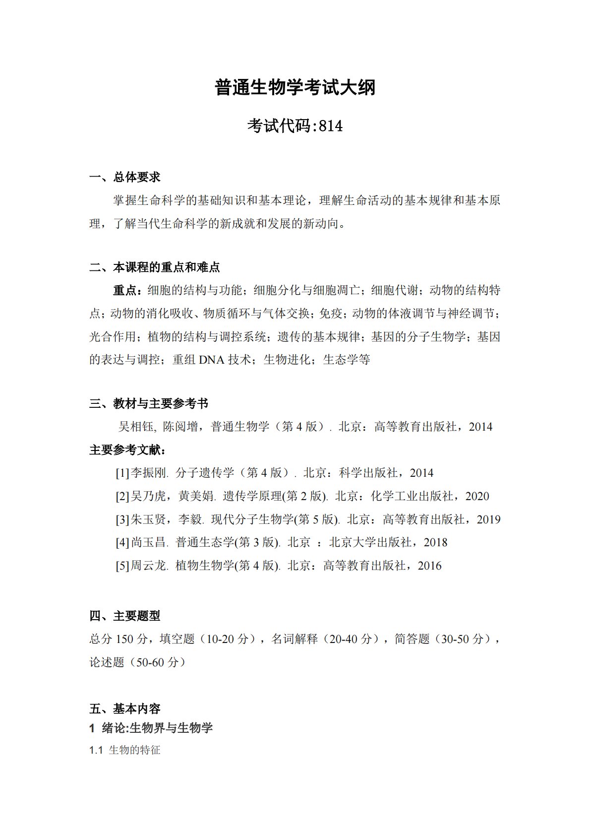 普通生物学考试大纲考试代码:814一、总体要求掌握生命科学的基础知识和基本理论,理解生命活动的基本规律和基本原理,了解当代生命科学的新成就和发展的新动向。二、本课程的重点和难点重点:细胞的结构与功能;细胞分化与细胞凋亡;细胞代谢;动物的结构特点;动物的消化吸收、物质循环与气体交换;免疫;动物的体液调节与神经调节;光合作用;植物的结构与调控系统;遗传的基本规律;基因的分子生物学;基因的表达与调控;重组DNA技术;生物进化;生态学等三、教材与主要参考书吴相钰,陈阅增,普通生物学(第4版).北京:高等教育出版社,2014主要参考文献:[1]李振刚.分子遗传学(第4版).北京:科学出版社,2014[2...