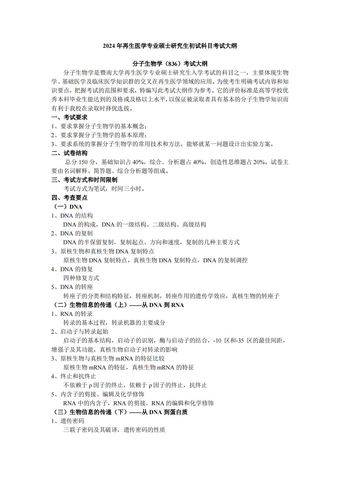 2024年再生医学专业硕士研究生初试科目考试大纲分子生物学(836)考试大纲分子生物学是暨南大学再生医学专业硕士研究生入学考试的科目之一,主要体现生物学、基础医学及临床医学知识群的交叉在再生医学领域的应用。为使考生明确考试内容和知识要点,把握考试的范围和要求,特编写此考试大纲作为参考。它的评价标准是高等学校优秀本科毕业生能达到的及格或及格以上水平,以保证被录取者具有基本的分子生物学知识而有利于我校在录取时择优选拔。一、考试要求1、要求掌握分子生物学的基本概念;2、要求掌握分子生物学的基本原理;3、要求系统的掌握分子生物学的常用技术和方法,能够就某一问题设计出实验方案。二、试卷结构总分150分,...