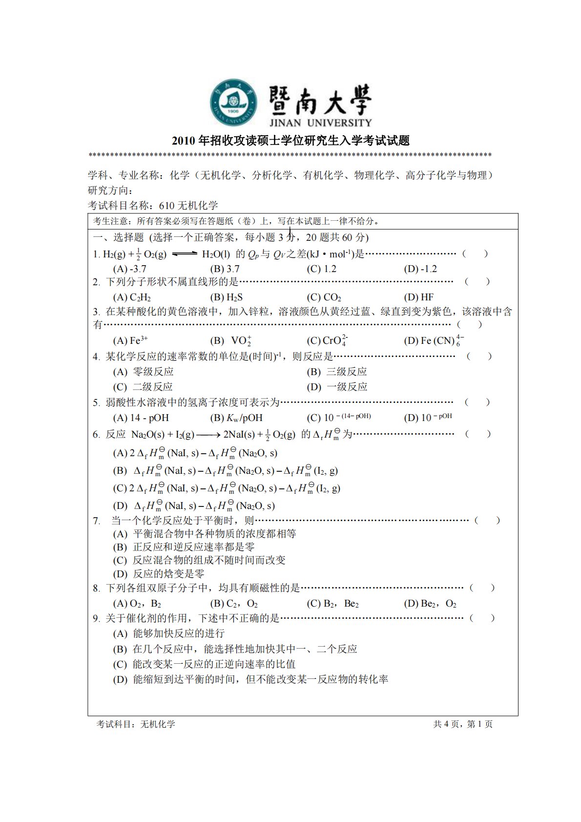 2010年招收攻读硕士学位研究生入学考试试题********************************************************************************************学科、专业名称:化学(无机化学、分析化学、有机化学、物理化学、高分子化学与物理)研究方向:考试科目名称:610无机化学考生注意:所有答案必须写在答题纸(卷)上,写在本试题上一律不给分。一、选择题(选择一个正确答案,每小题3分,20题共60分)1.H2(g)+21O2(g)H2O(l)的Qp与QV之差(kJ·mol-1)是………………………()(A)-3.7(B)3.7(...