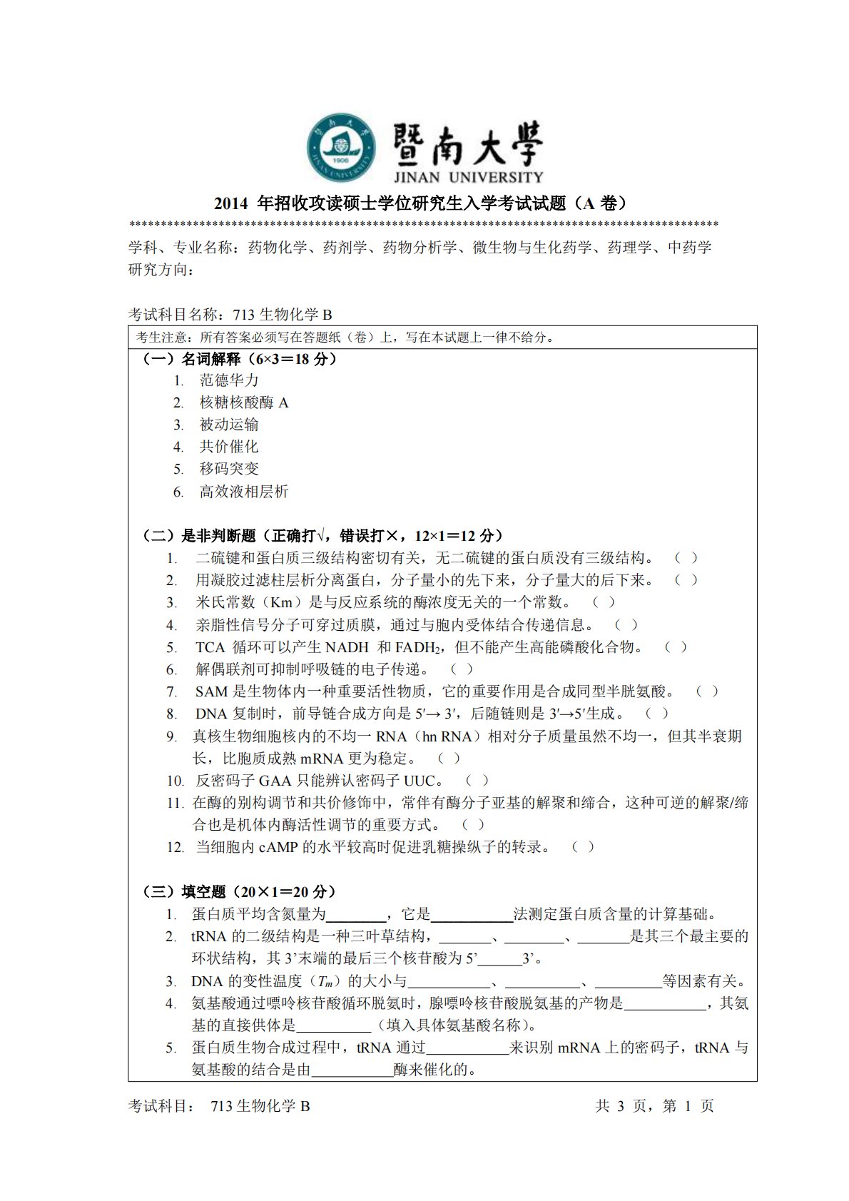 考试科目:713生物化学B共3页,第1页2014年招收攻读硕士学位研究生入学考试试题(A卷)********************************************************************************************学科、专业名称:药物化学、药剂学、药物分析学、微生物与生化药学、药理学、中药学研究方向:考试科目名称:713生物化学B考生注意:所有答案必须写在答题纸(卷)上,写在本试题上一律不给分。(一)名词解释(6×3=18分)1.范德华力2.核糖核酸酶A3.被动运输4.共价催化5.移码突变6.高效液相层析(二)是非判断题(正确打√,...
