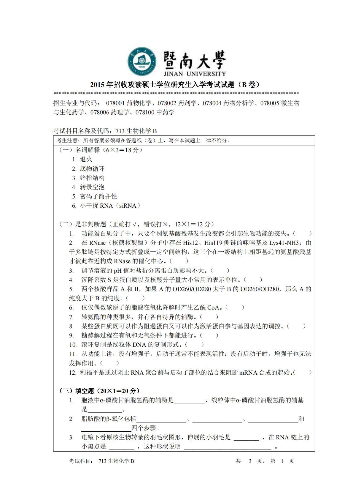 考试科目:713生物化学B共3页,第1页2015年招收攻读硕士学位研究生入学考试试题(B卷)********************************************************************************************招生专业与代码:078001药物化学、078002药剂学、078004药物分析学、078005微生物与生化药学、078006药理学、078100中药学考试科目名称及代码:713生物化学B考生注意:所有答案必须写在答题纸(卷)上,写在本试题上一律不给分。(一)名词解释(6×3=18分)1.退火2.底物循环3.锌指结构4.转录...