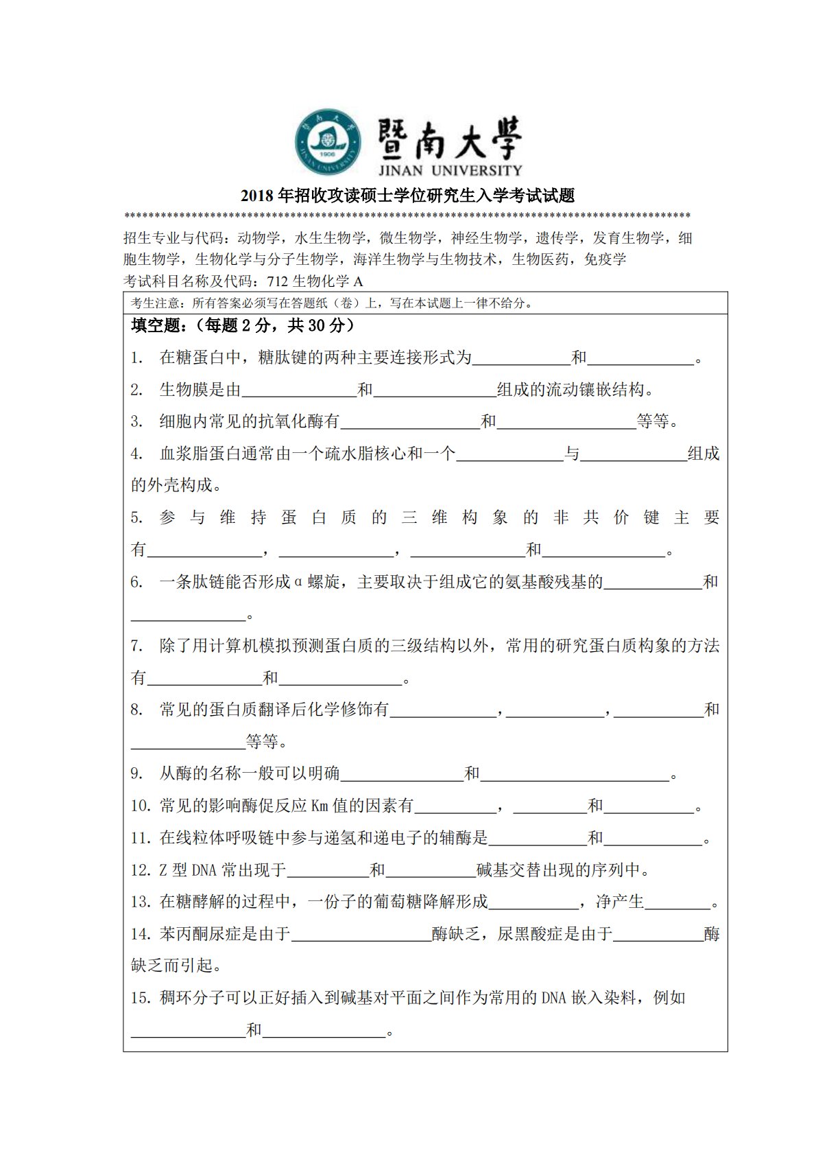 2018年招收攻读硕士学位研究生入学考试试题********************************************************************************************招生专业与代码:动物学,水生生物学,微生物学,神经生物学,遗传学,发育生物学,细胞生物学,生物化学与分子生物学,海洋生物学与生物技术,生物医药,免疫学考试科目名称及代码:712生物化学A考生注意:所有答案必须写在答题纸(卷)上,写在本试题上一律不给分。填空题:(每题2分,共30分)1.在糖蛋白中,糖肽键的两种主要连接形式为和。2.生物膜是由和组成的流动镶嵌结构。3.细胞...