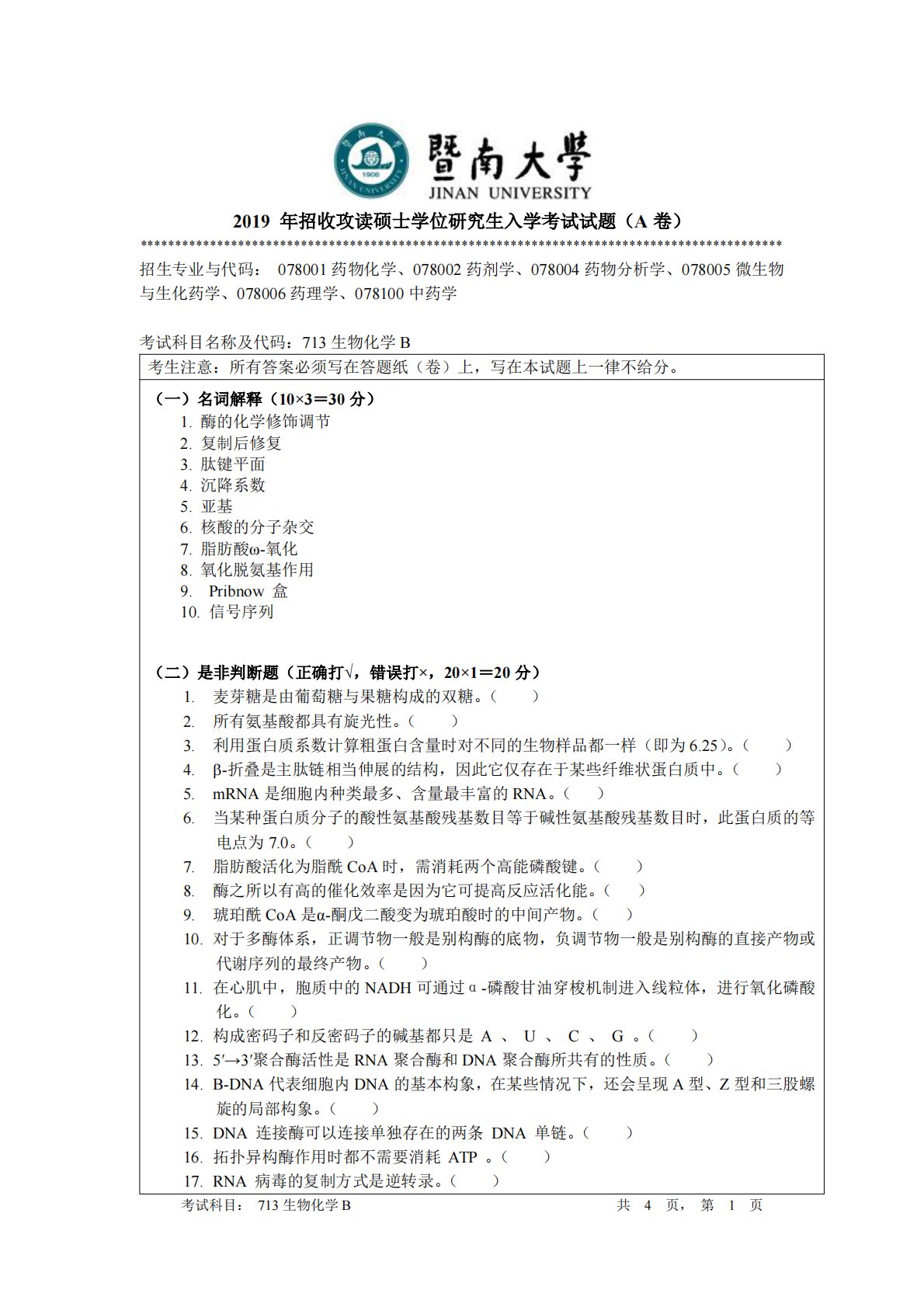 考试科目:713生物化学B共4页,第1页2019年招收攻读硕士学位研究生入学考试试题(A卷)********************************************************************************************招生专业与代码:078001药物化学、078002药剂学、078004药物分析学、078005微生物与生化药学、078006药理学、078100中药学考试科目名称及代码:713生物化学B考生注意:所有答案必须写在答题纸(卷)上,写在本试题上一律不给分。(一)名词解释(10×3=30分)1.酶的化学修饰调节2.复制后修复3....