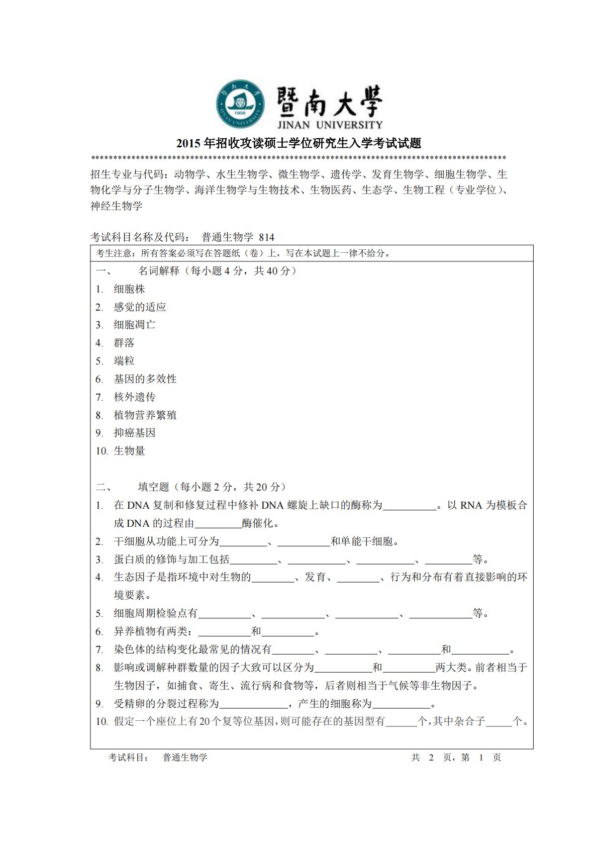 2015年招收攻读硕士学位研究生入学考试试题********************************************************************************************招生专业与代码:动物学、水生生物学、微生物学、遗传学、发育生物学、细胞生物学、生物化学与分子生物学、海洋生物学与生物技术、生物医药、生态学、生物工程(专业学位)、神经生物学考试科目名称及代码:普通生物学814考生注意:所有答案必须写在答题纸(卷)上,写在本试题上一律不给分。一、名词解释(每小题4分,共40分)1.细胞株2.感觉的适应3.细胞凋亡4.群落5.端粒6.基因的...