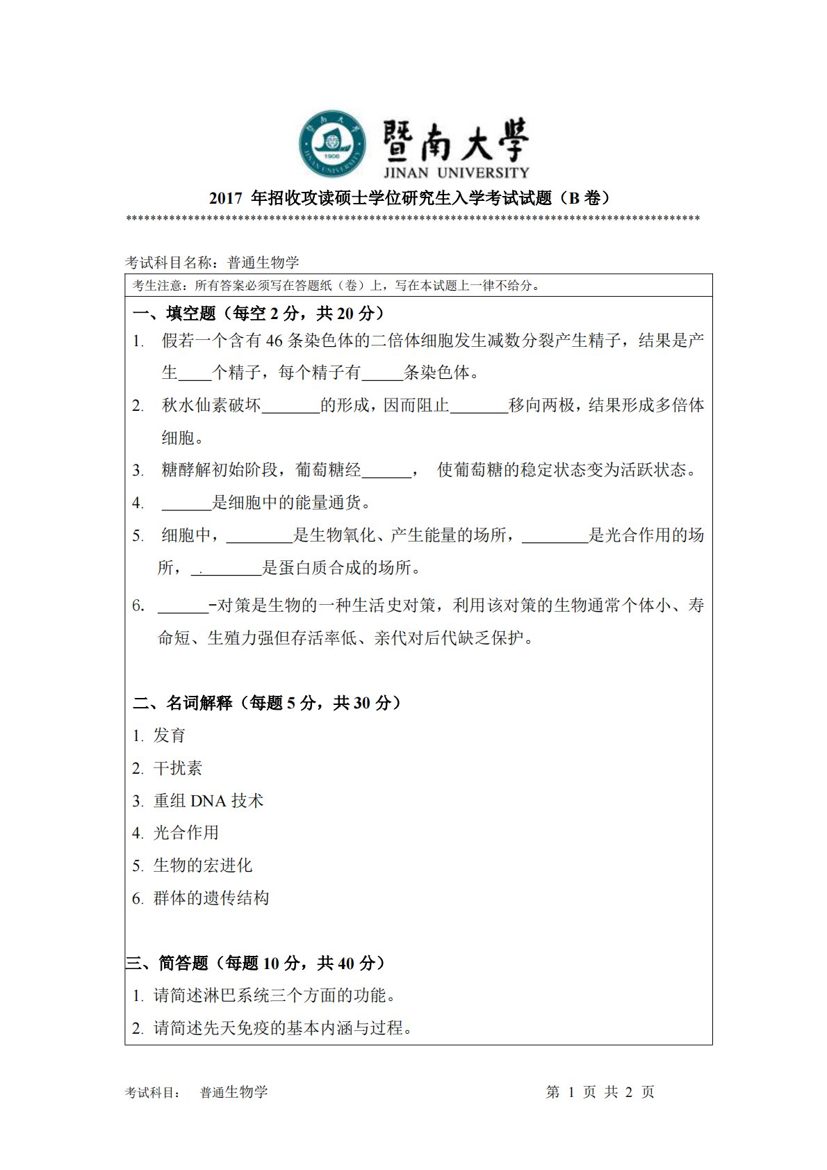 暨南大学814普通生物学2017年真题
