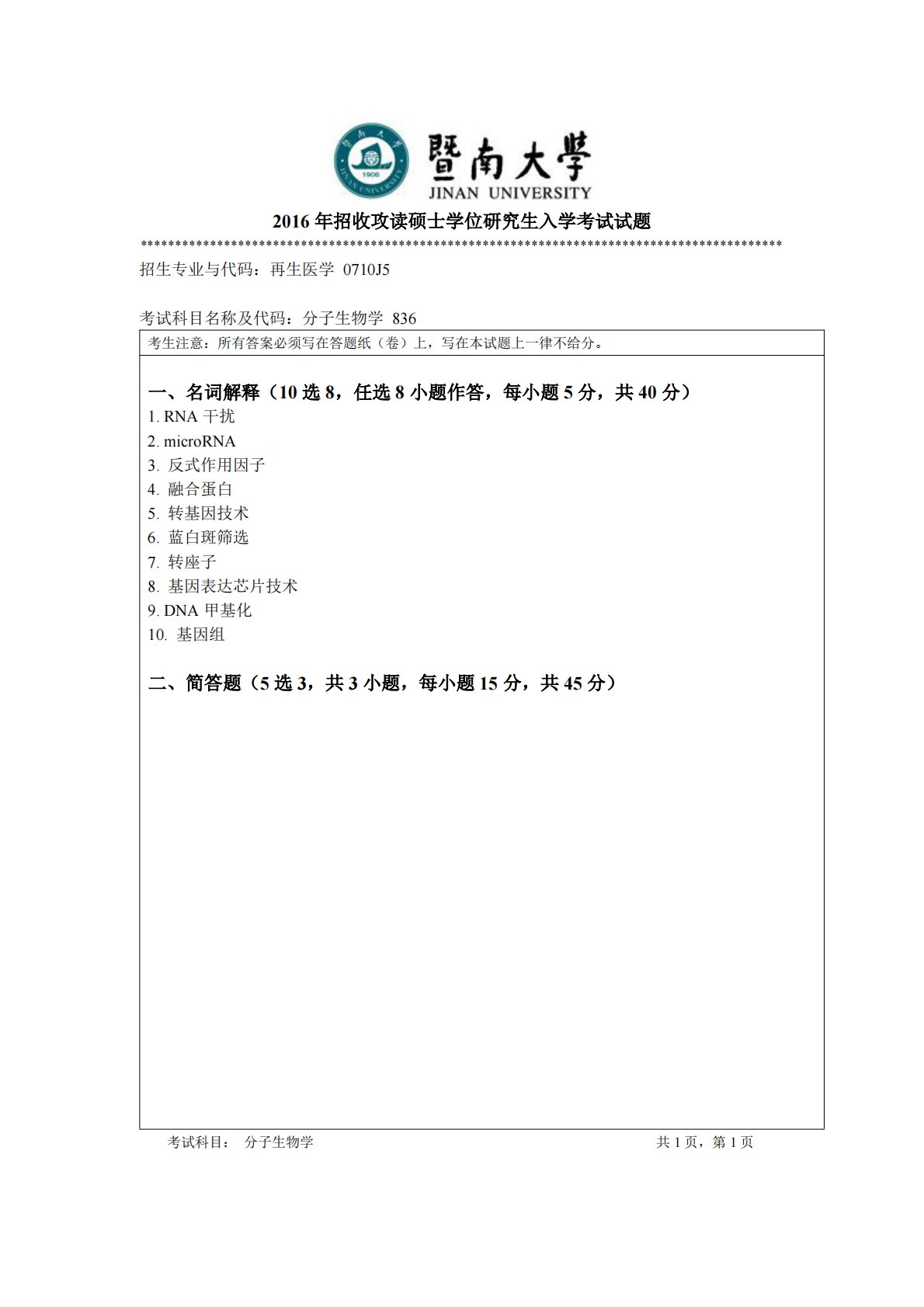 暨南大学836分子生物学2016年真题