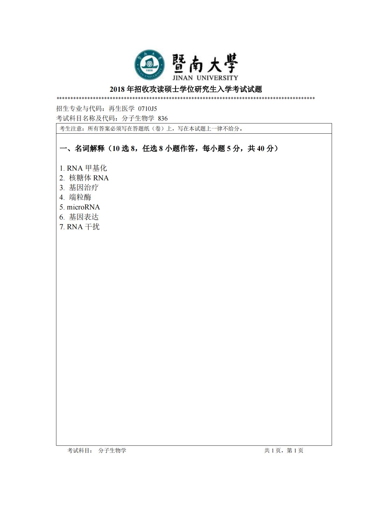 2018年招收攻读硕士学位研究生入学考试试题********************************************************************************************招生专业与代码:再生医学0710J5考试科目名称及代码:分子生物学836考生注意:所有答案必须写在答题纸(卷)上,写在本试题上一律不给分。一、名词解释(10选8,任选8小题作答,每小题5分,共40分)1.RNA甲基化2.核糖体RNA3.基因治疗4.端粒酶5.microRNA6.基因表达7.RNA干扰考试科目:分子生物学共1页,第1页2018年招收攻读硕士学位研究生入学考...