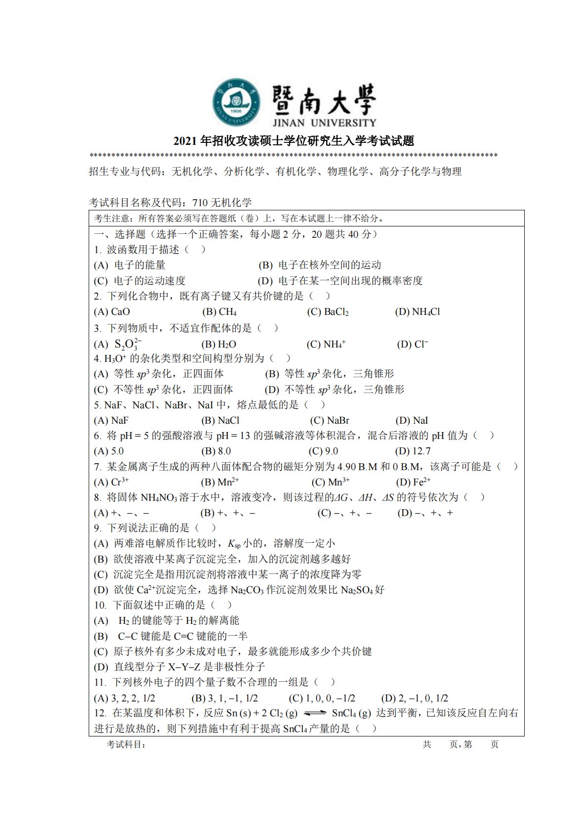 2021年招收攻读硕士学位研究生入学考试试题********************************************************************************************招生专业与代码:无机化学、分析化学、有机化学、物理化学、高分子化学与物理考试科目名称及代码:710无机化学考生注意:所有答案必须写在答题纸(卷)上,写在本试题上一律不给分。一、选择题(选择一个正确答案,每小题2分,20题共40分)1.波函数用于描述()(A)电子的能量(B)电子在核外空间的运动(C)电子的运动速度(D)电子在某一空间出现的概率密度2.下列化合物中,既有离...