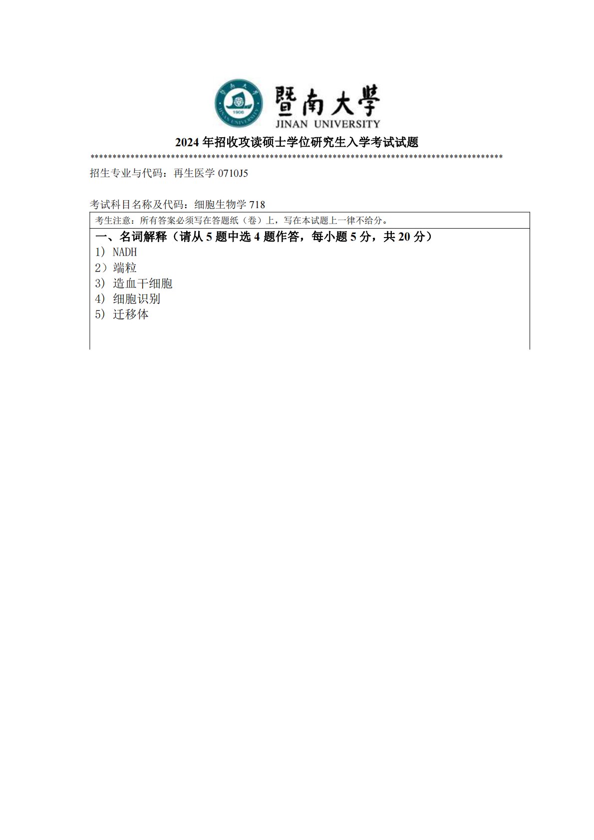 暨南大学718细胞生物学2024年真题