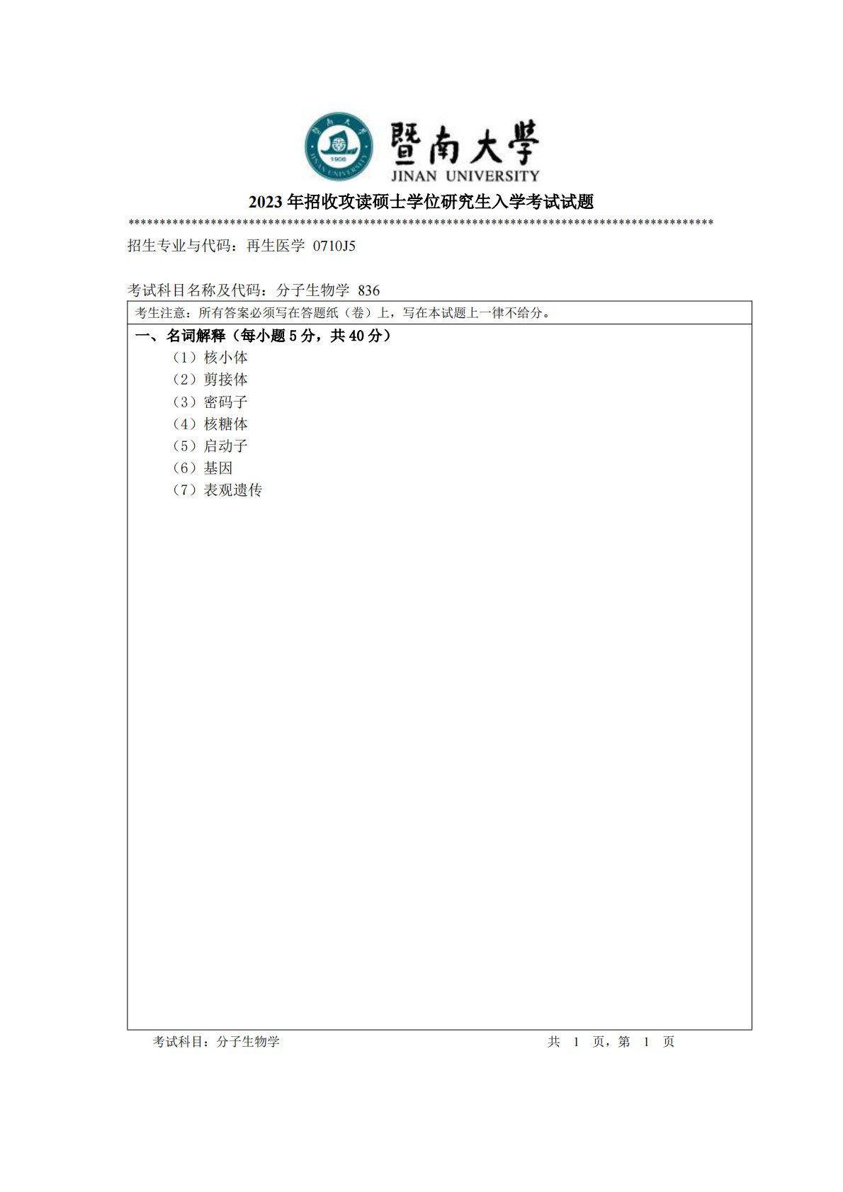 暨南大学836分子生物学2023年真题
