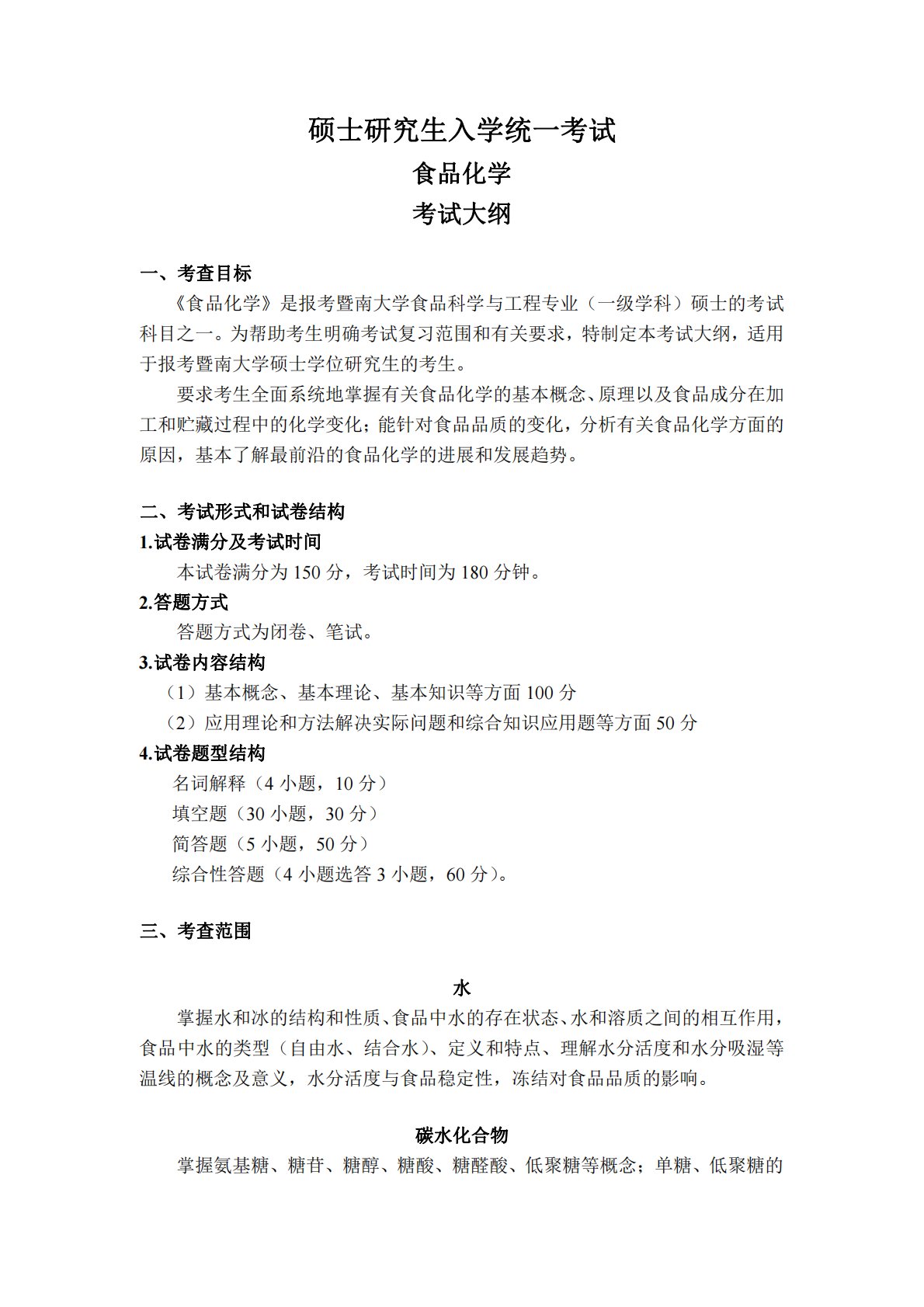 硕士研究生入学统一考试食品化学考试大纲一、考查目标《食品化学》是报考暨南大学食品科学与工程专业(一级学科)硕士的考试科目之一。为帮助考生明确考试复习范围和有关要求,特制定本考试大纲,适用于报考暨南大学硕士学位研究生的考生。要求考生全面系统地掌握有关食品化学的基本概念、原理以及食品成分在加工和贮藏过程中的化学变化;能针对食品品质的变化,分析有关食品化学方面的原因,基本了解最前沿的食品化学的进展和发展趋势。二、考试形式和试卷结构1.试卷满分及考试时间本试卷满分为150分,考试时间为180分钟。2.答题方式答题方式为闭卷、笔试。3.试卷内容结构(1)基本概念、基本理论、基本知识等方面100分(2)应...