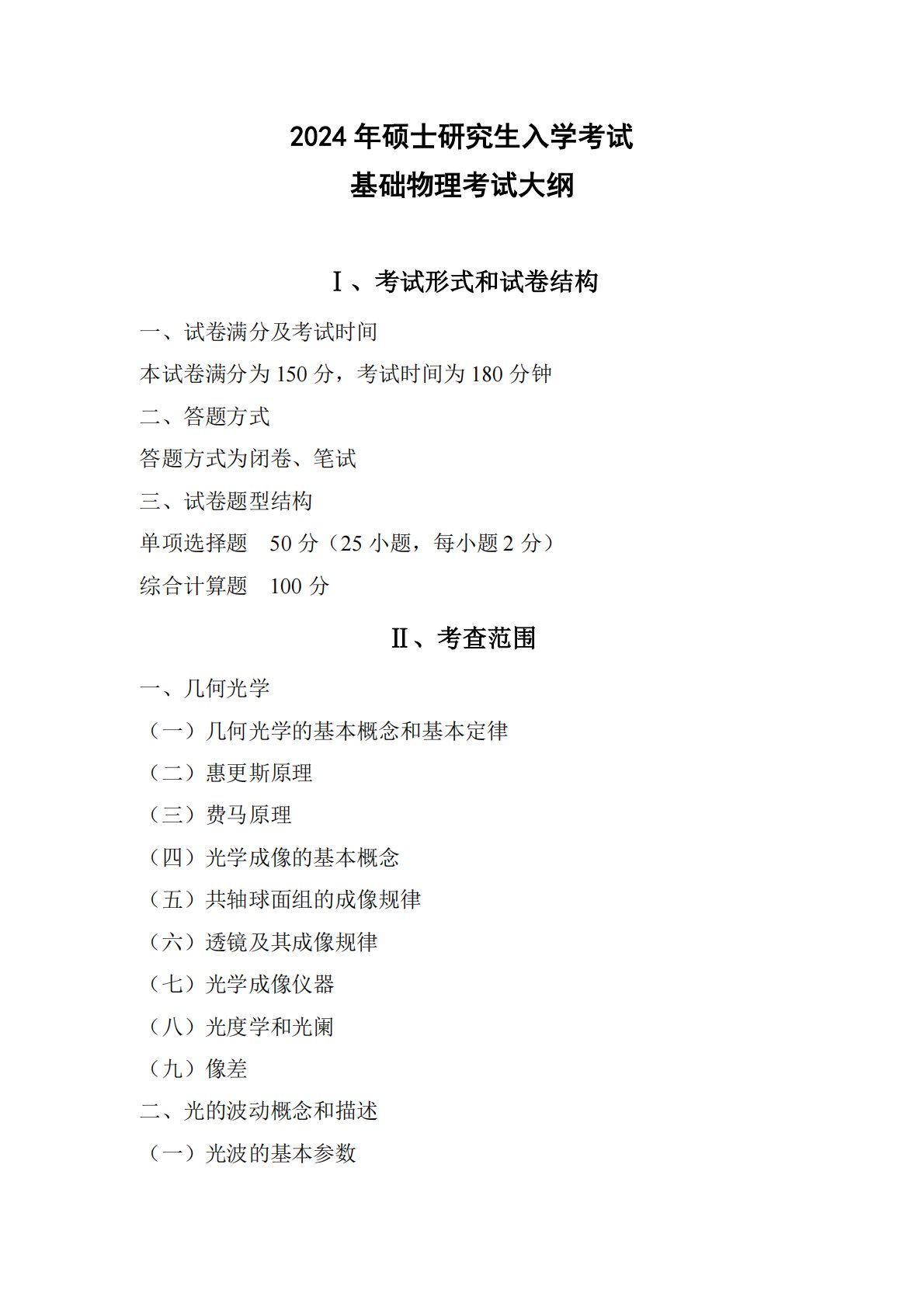 2024年硕士研究生入学考试基础物理考试大纲Ⅰ、考试形式和试卷结构一、试卷满分及考试时间本试卷满分为150分,考试时间为180分钟二、答题方式答题方式为闭卷、笔试三、试卷题型结构单项选择题50分(25小题,每小题2分)综合计算题100分Ⅱ、考查范围一、几何光学(一)几何光学的基本概念和基本定律(二)惠更斯原理(三)费马原理(四)光学成像的基本概念(五)共轴球面组的成像规律(六)透镜及其成像规律(七)光学成像仪器(八)光度学和光阑(九)像差二、光的波动概念和描述(一)光波的基本参数(二)光波的基本分类及其数学描述三、光的偏振y#,´_1四、光的反射和折射(一)入射反射和折射光的光矢量...
