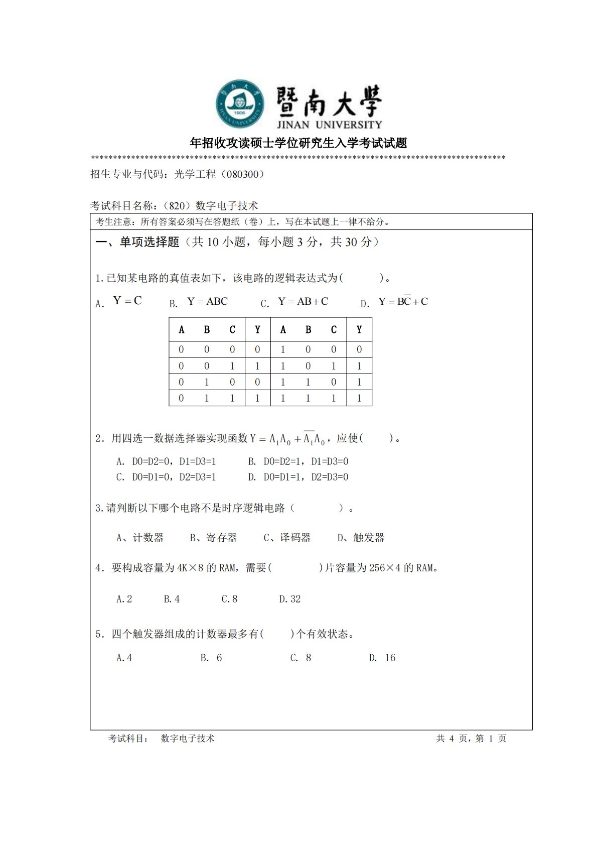 年招收攻读硕士学位研究生入学考试试题********************************************************************************************招生专业与代码:光学工程(080300)考试科目名称:(820)数字电子技术考生注意:所有答案必须写在答题纸(卷)上,写在本试题上一律不给分。一、单项选择题(共10小题,每小题3分,共30分)1.已知某电路的真值表如下,该电路的逻辑表达式为()。A.CYB.ABCYC.CABYD.CCBYABCYABCY0000100000111011010011010111111...