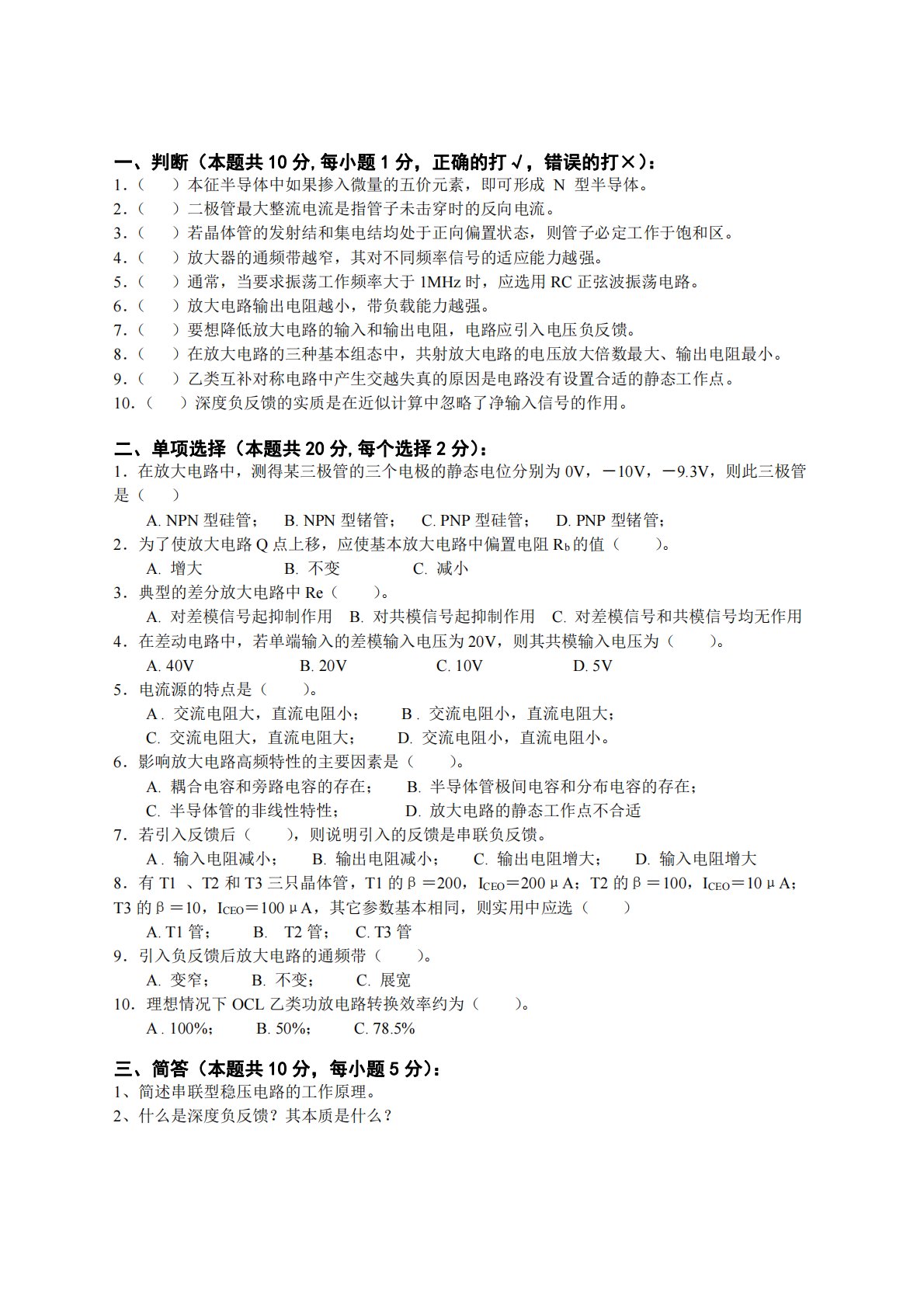 一、判断(本题共10分,每小题1分,正确的打√,错误的打×):1.()本征半导体中如果掺入微量的五价元素,即可形成N型半导体。2.()二极管最大整流电流是指管子未击穿时的反向电流。3.()若晶体管的发射结和集电结均处于正向偏置状态,则管子必定工作于饱和区。4.()放大器的通频带越窄,其对不同频率信号的适应能力越强。5.()通常,当要求振荡工作频率大于1MHz时,应选用RC正弦波振荡电路。6.()放大电路输出电阻越小,带负载能力越强。7.()要想降低放大电路的输入和输出电阻,电路应引入电压负反馈。8.()在放大电路的三种基本组态中,共射放大电路的电压放大倍数最大、输出电阻最小。9.()乙类互补对...