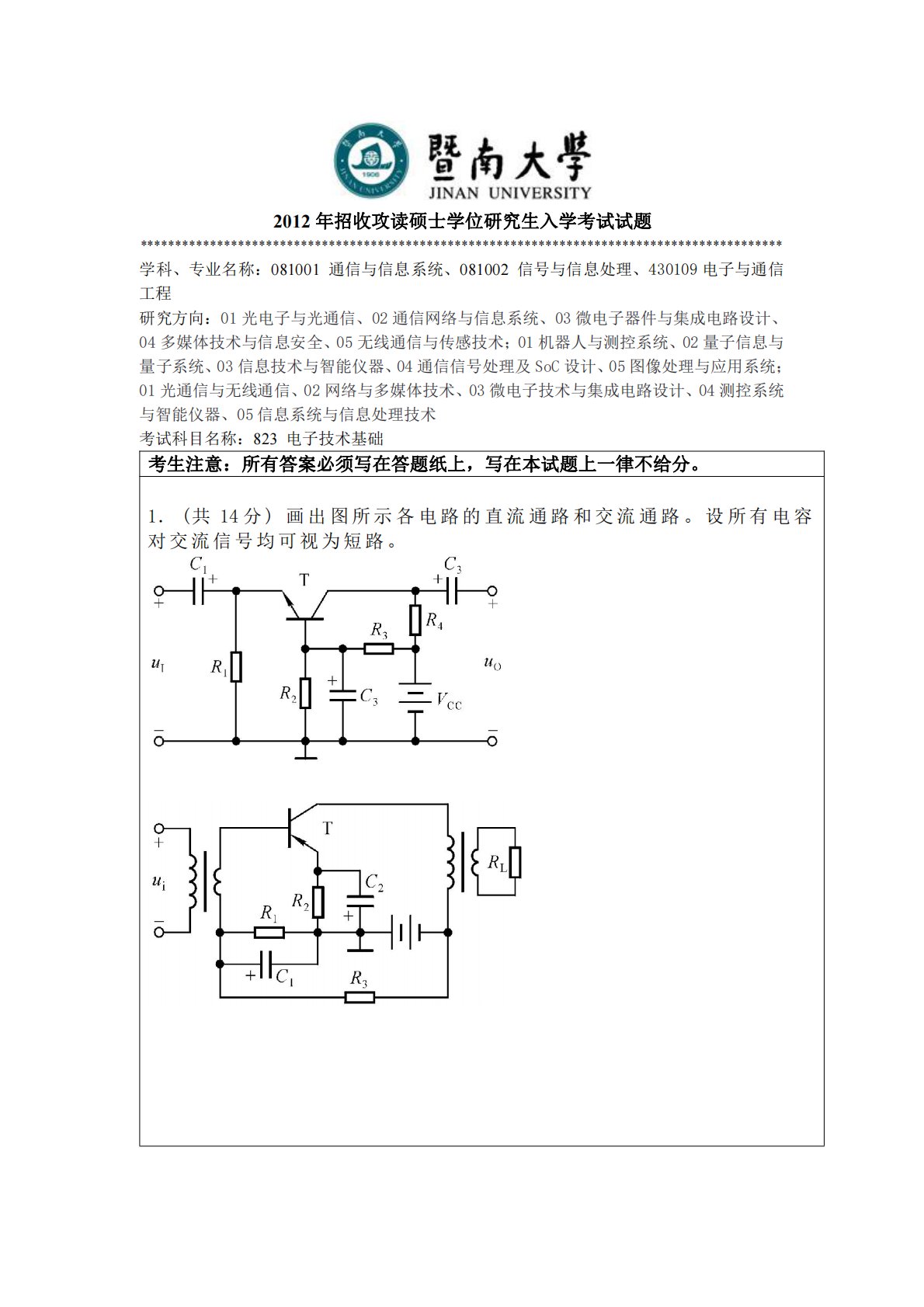 暨南大学823电子技术基础2012年真题