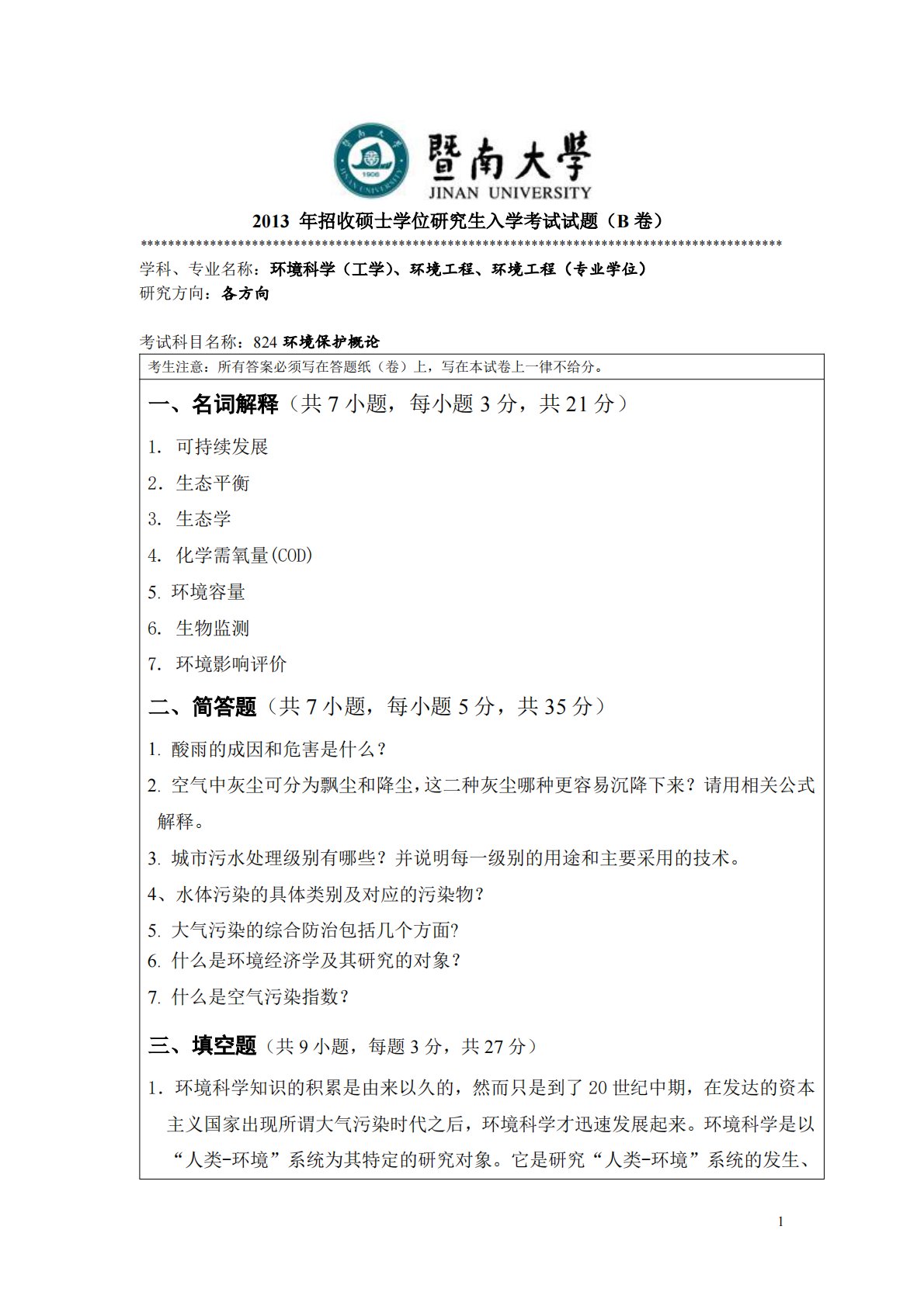 暨南大学824环境保护概论2013年真题