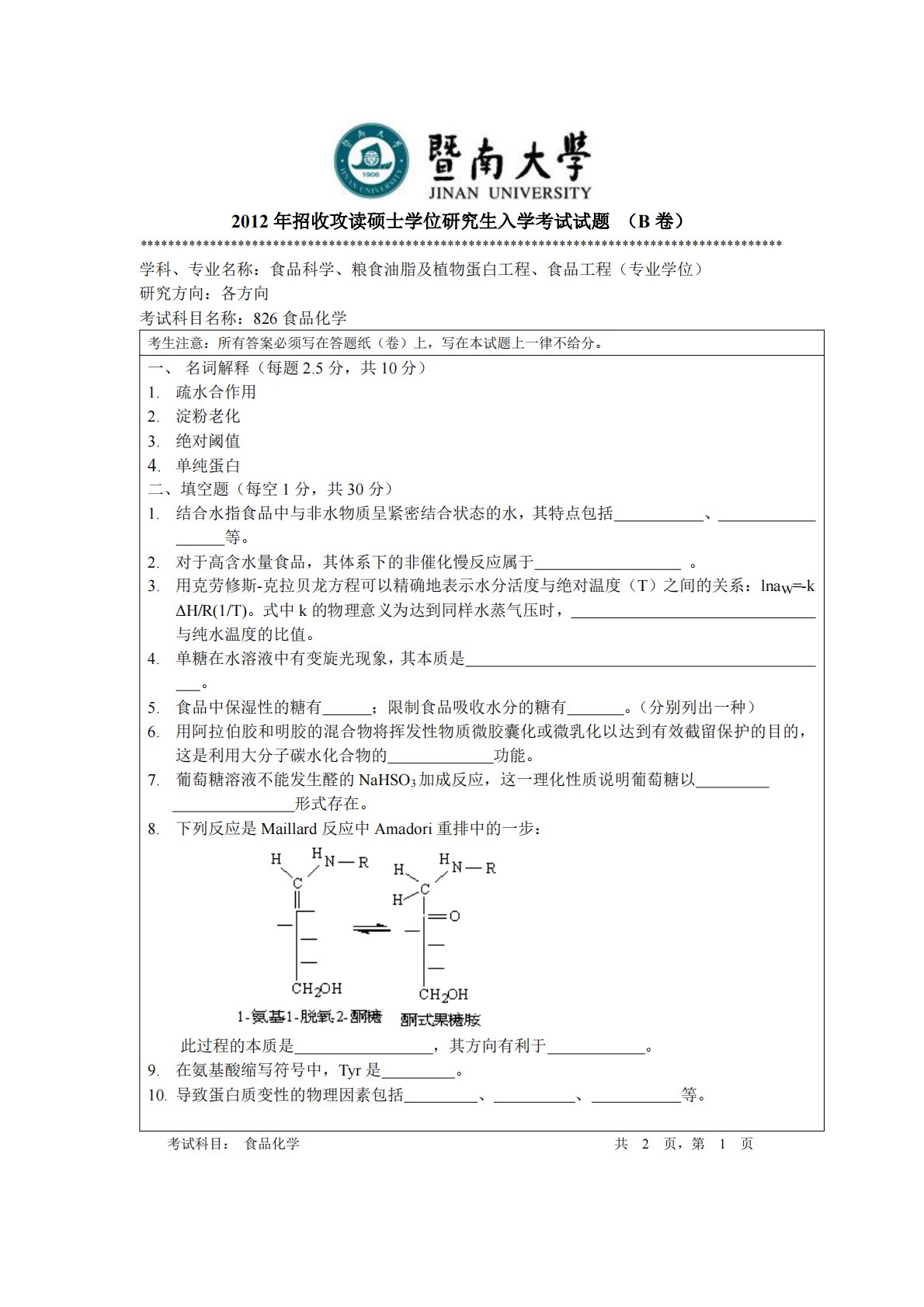 2012年招收攻读硕士学位研究生入学考试试题(B卷)********************************************************************************************学科、专业名称:食品科学、粮食油脂及植物蛋白工程、食品工程(专业学位)研究方向:各方向考试科目名称:826食品化学考生注意:所有答案必须写在答题纸(卷)上,写在本试题上一律不给分。一、名词解释(每题2.5分,共10分)1.疏水合作用2.淀粉老化3.绝对阈值4.单纯蛋白二、填空题(每空1分,共30分)1.结合水指食品中与非水物质呈紧密结合状态的水,其特点包括、等。...