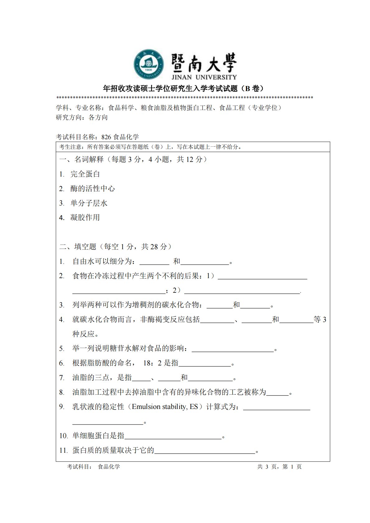 年招收攻读硕士学位研究生入学考试试题(B卷)********************************************************************************************学科、专业名称:食品科学、粮食油脂及植物蛋白工程、食品工程(专业学位)研究方向:各方向考试科目名称:826食品化学考生注意:所有答案必须写在答题纸(卷)上,写在本试题上一律不给分。一、名词解释(每题3分,4小题,共12分)1.完全蛋白2.酶的活性中心3.单分子层水4.凝胶作用二、填空题(每空1分,共28分)1.自由水可以细分为:和。2.食物在冷冻过程中产生两个不利的后果...