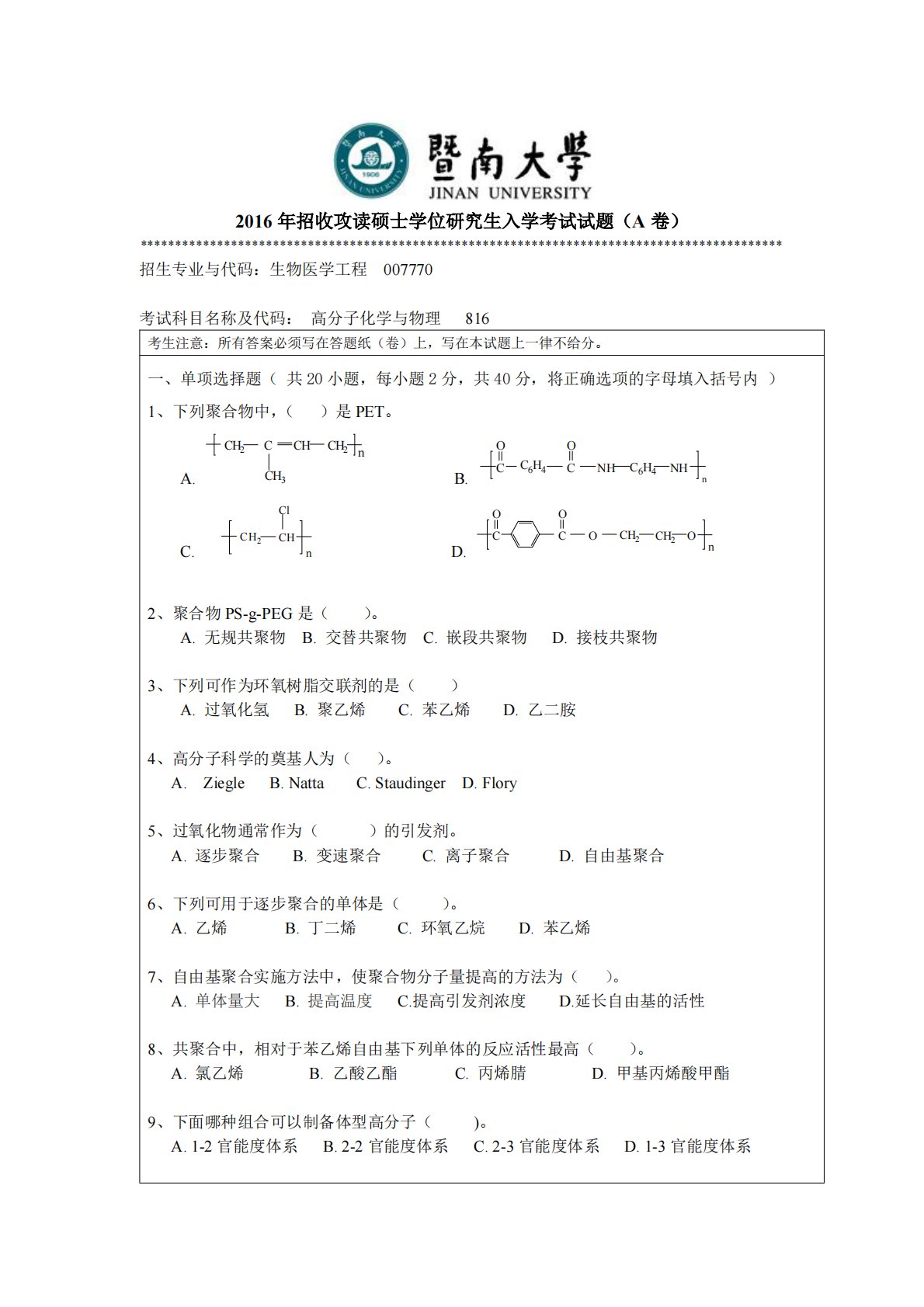 2016年招收攻读硕士学位研究生入学考试试题(A卷)********************************************************************************************招生专业与代码:生物医学工程007770考试科目名称及代码:高分子化学与物理816考生注意:所有答案必须写在答题纸(卷)上,写在本试题上一律不给分。一、单项选择题(共20小题,每小题2分,共40分,将正确选项的字母填入括号内)1、下列聚合物中,()是PET。A.CCH2nCHCH2CH3B.OCNHOCNHC6H4C6H4nC.CHClCH2nD.OCCH2CH...