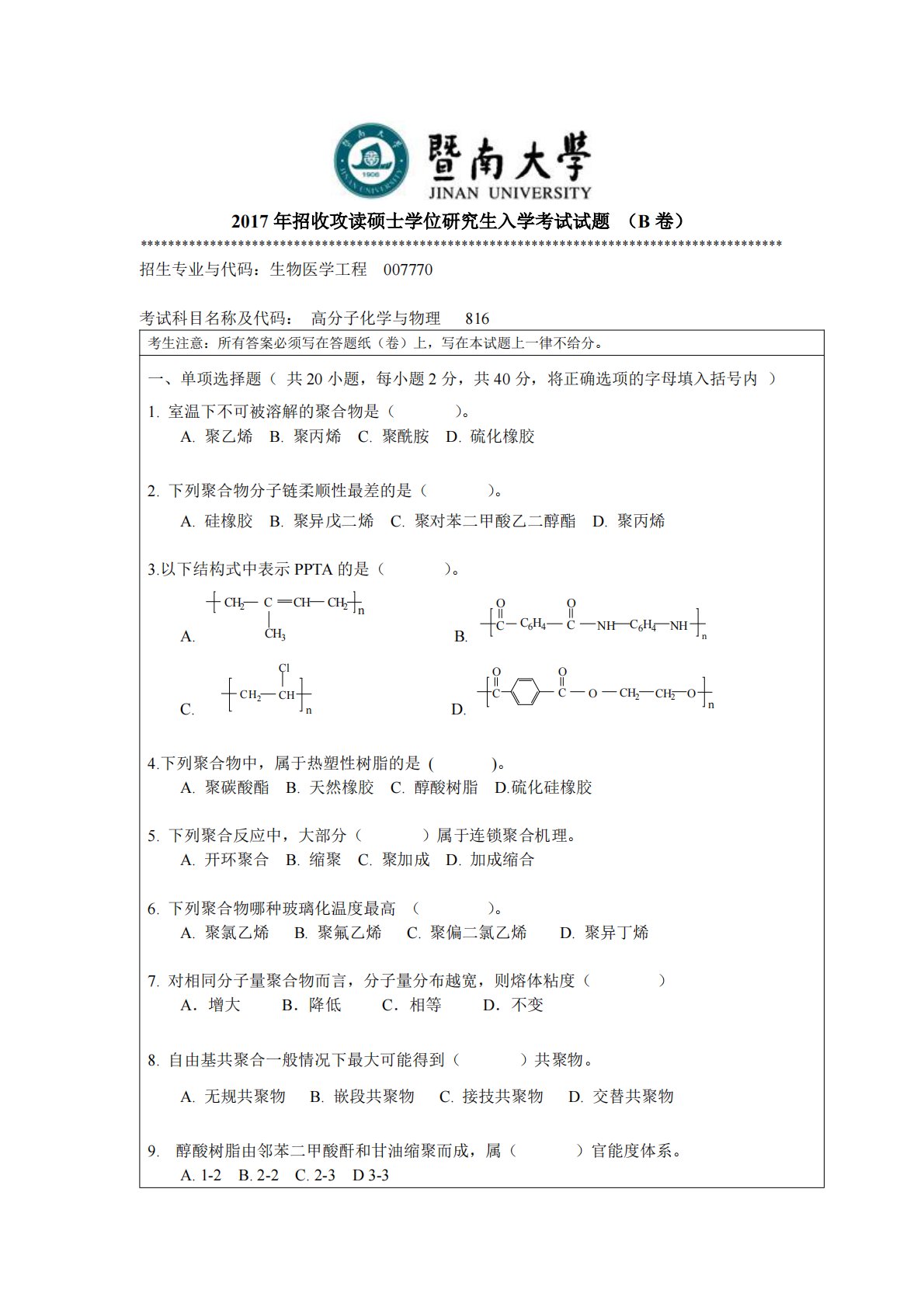 2017年招收攻读硕士学位研究生入学考试试题(B卷)********************************************************************************************招生专业与代码:生物医学工程007770考试科目名称及代码:高分子化学与物理816考生注意:所有答案必须写在答题纸(卷)上,写在本试题上一律不给分。一、单项选择题(共20小题,每小题2分,共40分,将正确选项的字母填入括号内)1.室温下不可被溶解的聚合物是()。A.聚乙烯B.聚丙烯C.聚酰胺D.硫化橡胶2.下列聚合物分子链柔顺性最差的是()。A.硅橡胶B.聚异戊...