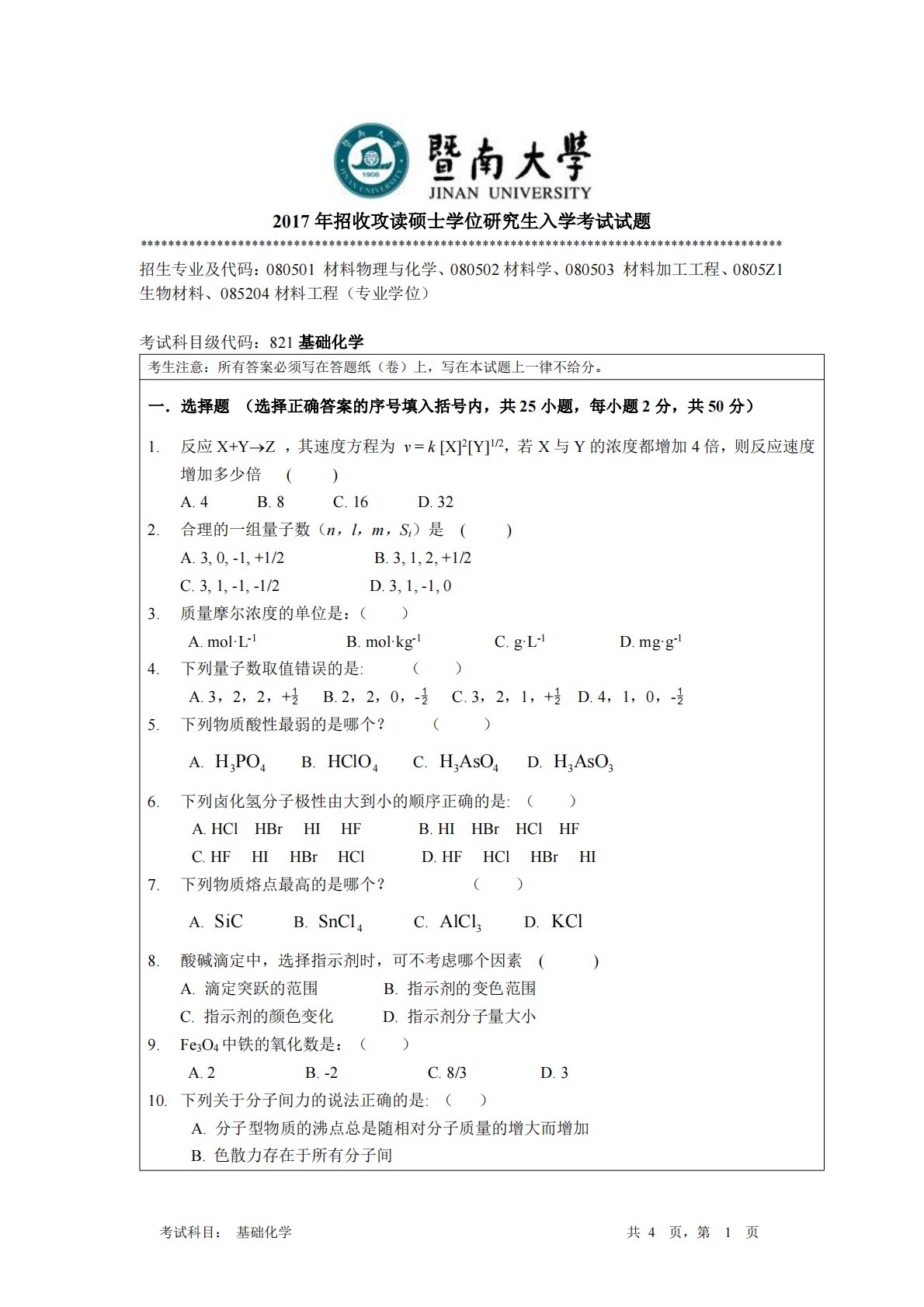 2017年招收攻读硕士学位研究生入学考试试题********************************************************************************************招生专业及代码:080501材料物理与化学、080502材料学、080503材料加工工程、0805Z1生物材料、085204材料工程(专业学位)考试科目级代码:821基础化学考生注意:所有答案必须写在答题纸(卷)上,写在本试题上一律不给分。一.选择题(选择正确答案的序号填入括号内,共25小题,每小题2分,共50分)1.反应X+YZ,其速度方程为v=k[X]2[Y]1/...