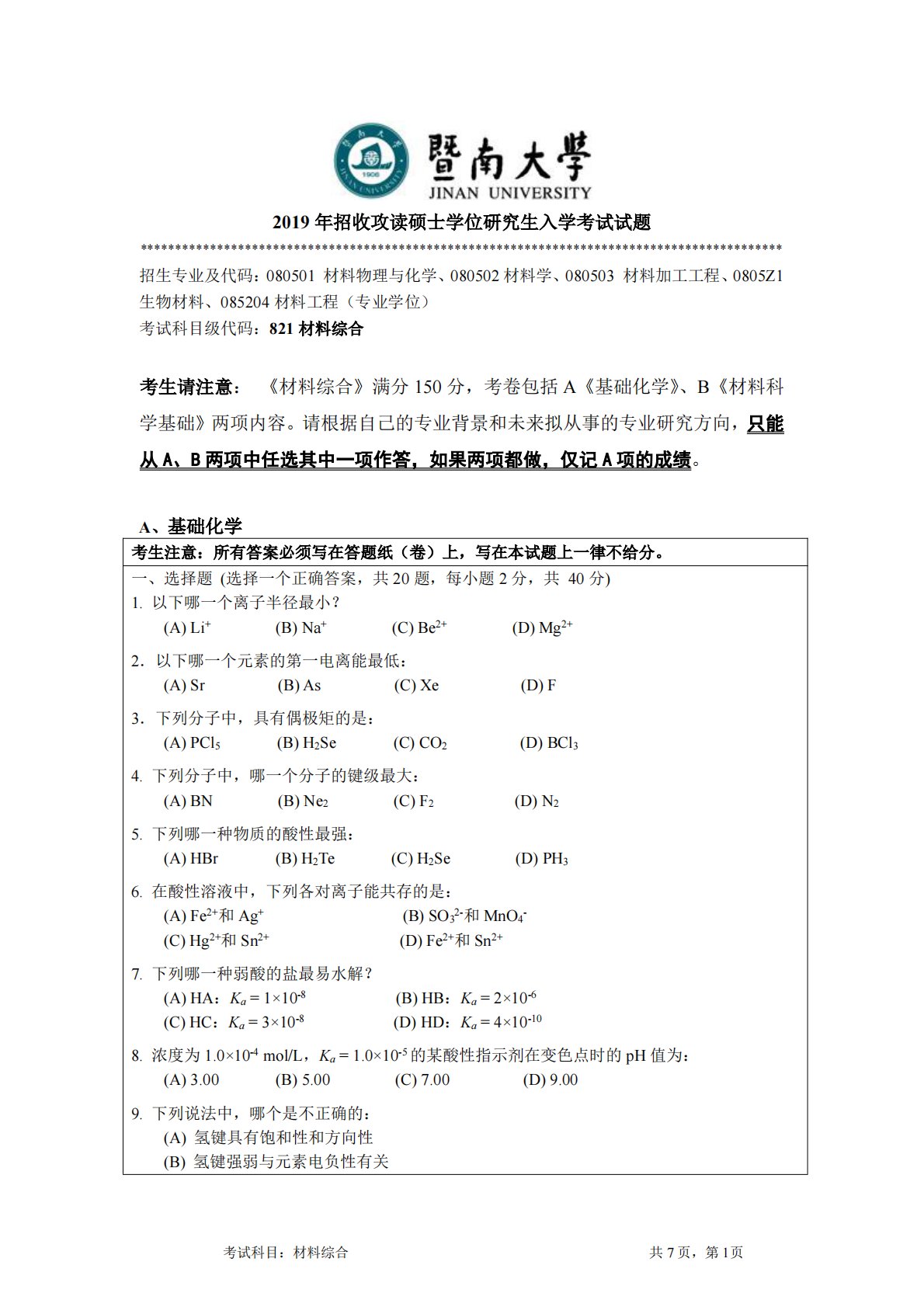 考试科目:材料综合共7页,第1页2019年招收攻读硕士学位研究生入学考试试题********************************************************************************************招生专业及代码:080501材料物理与化学、080502材料学、080503材料加工工程、0805Z1生物材料、085204材料工程(专业学位)考试科目级代码:821材料综合考生请注意:《材料综合》满分150分,考卷包括A《基础化学》、B《材料科学基础》两项内容。请根据自己的专业背景和未来拟从事的专业研究方向,只能从A、B两项中任选其中一...